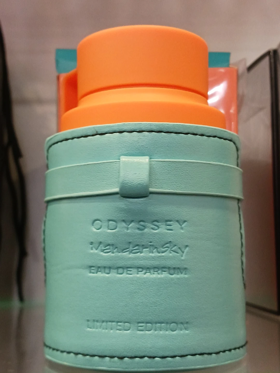 This is Odyssey Mandarin Sky Eau de Parfum. It's a limited edition fragrance. The bottle comes in a teal leather-like case with an orange cap.