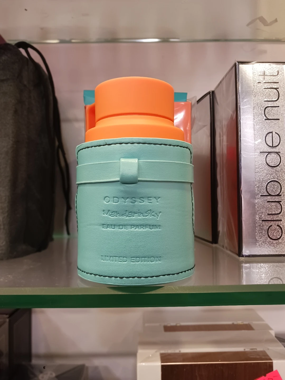 This is Odyssey Mandarin Sky Eau de Parfum. It's a limited edition fragrance. The bottle comes in a teal leather-like case with an orange cap.