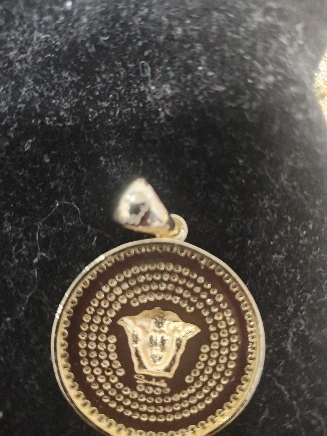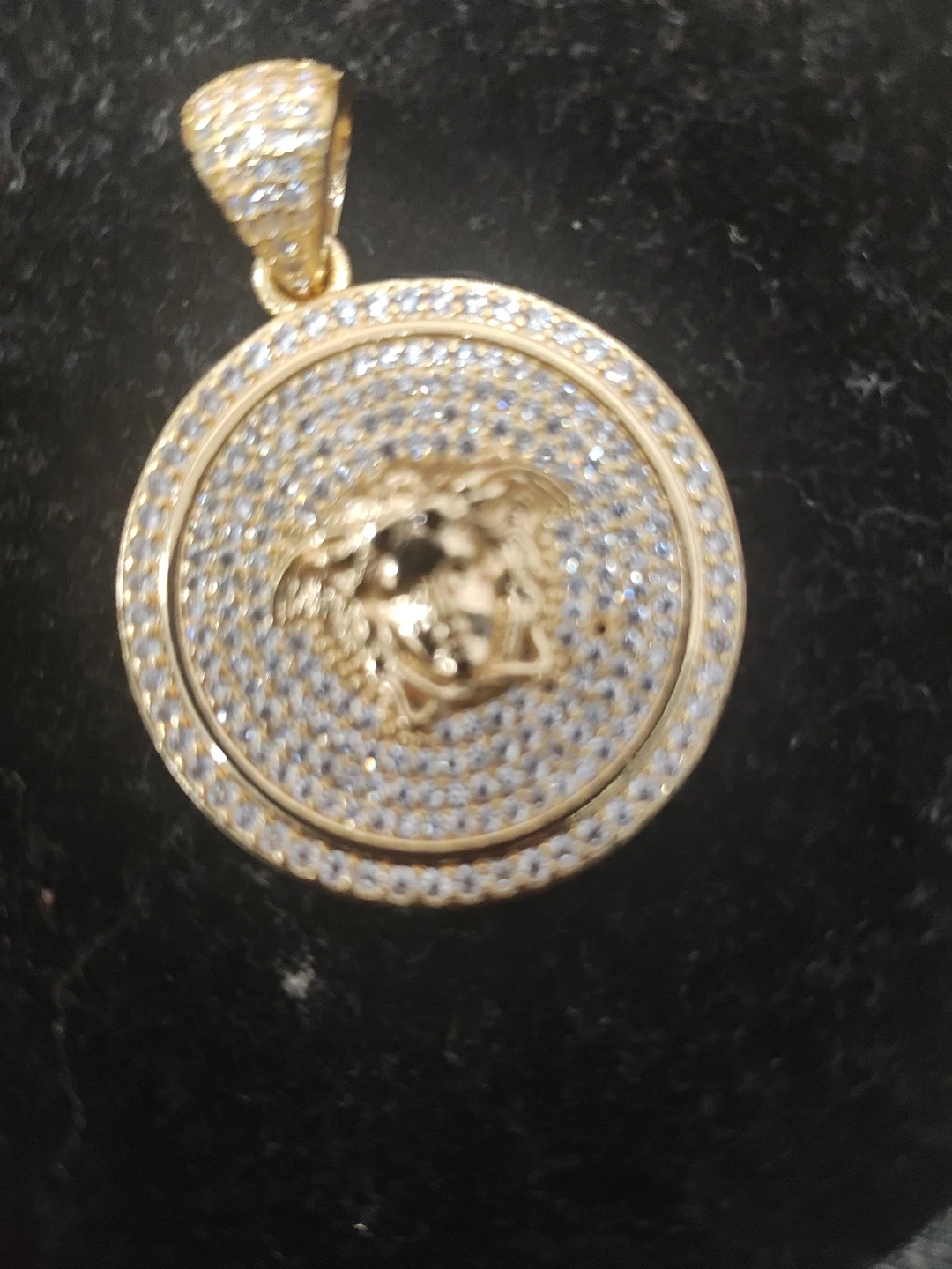 This pendant features a gold-toned medallion with a detailed Medusa head at its centre. It's encrusted with small, clear cubic zirconia stones around the border and on the bail. This piece offers a bold statement for any jewellery collection.
