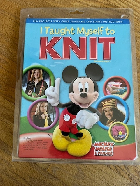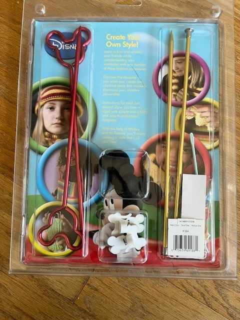 This is a new, unopened Mickey Moose Taught to Knit Kit. It includes: 1 set Mickey Mouse Needles, 1 set Size 8 Boye Aluminum Needles, 1 set Mickey Mouse Needle Toppers, 1 set Mickey Mouse Point Protectors, 15 stitch markers, and 2 yarn needles. Also comes with a 'How to Book'.