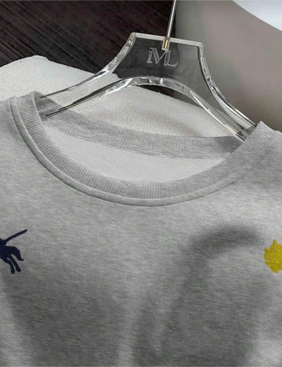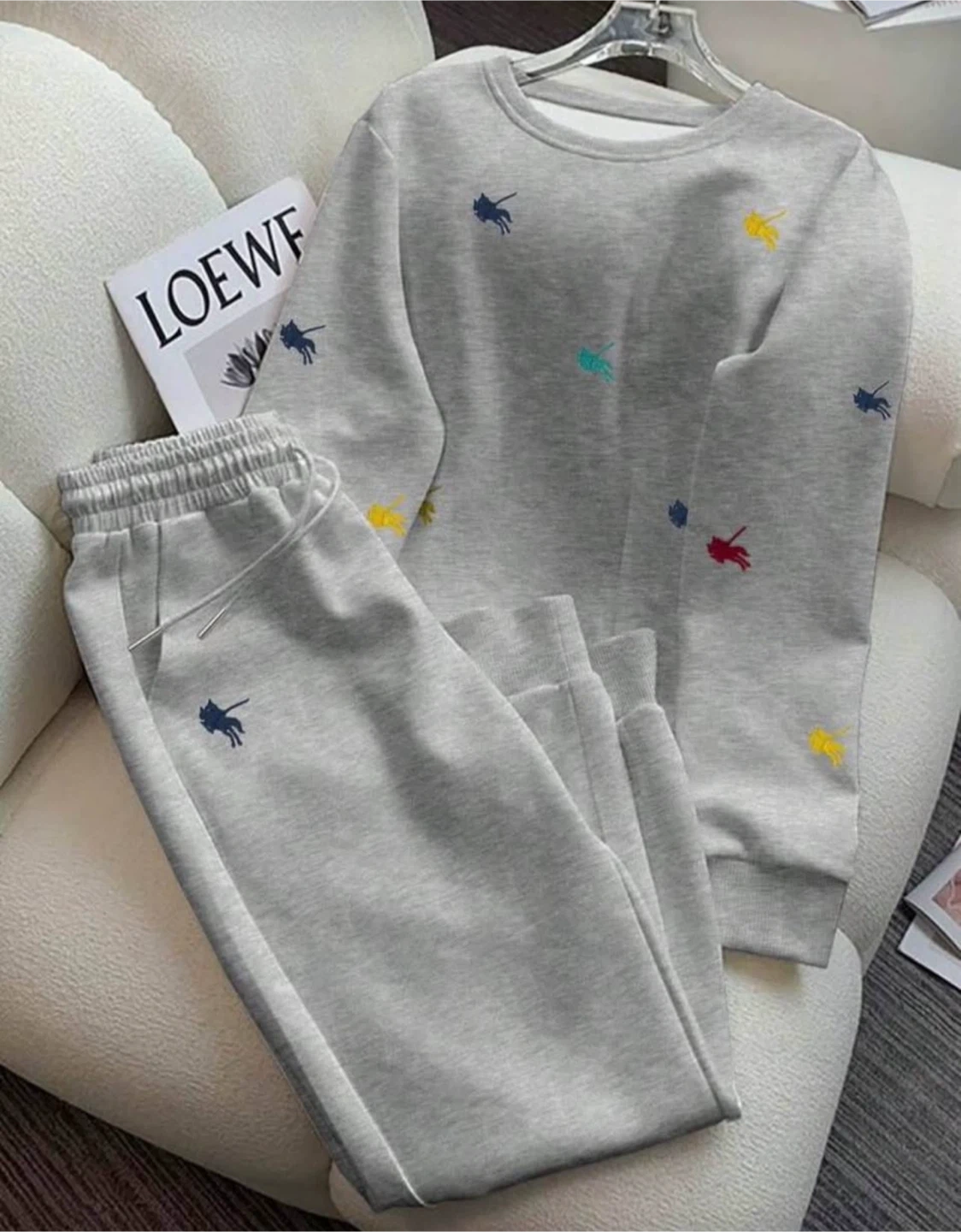 This is a grey fleece sweatshirt and matching joggers set. It features an embroidered horse logo on the left chest of the sweatshirt and left thigh of the joggers. The joggers have a drawstring waist and cuffed ankles. A comfy set for casual wear!