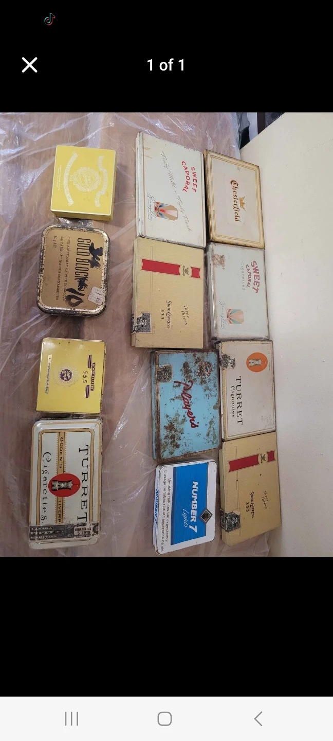Up for sell we have these 8 VINTAGE CIGARETTE TIN.1 GOLD BLOCK, 1×TURRET, 2× SWEET CAPORAL, 1x CHESTERFIELD 1x PLAYER and 2 x STATE EXPRESS 333 ect. The gold block tin as black marker on it and the players as some rust on it the rest of the tin or in pretty good condition asking $50 for the lot or $12 each pick up on beaverbrook lane kanata thank you