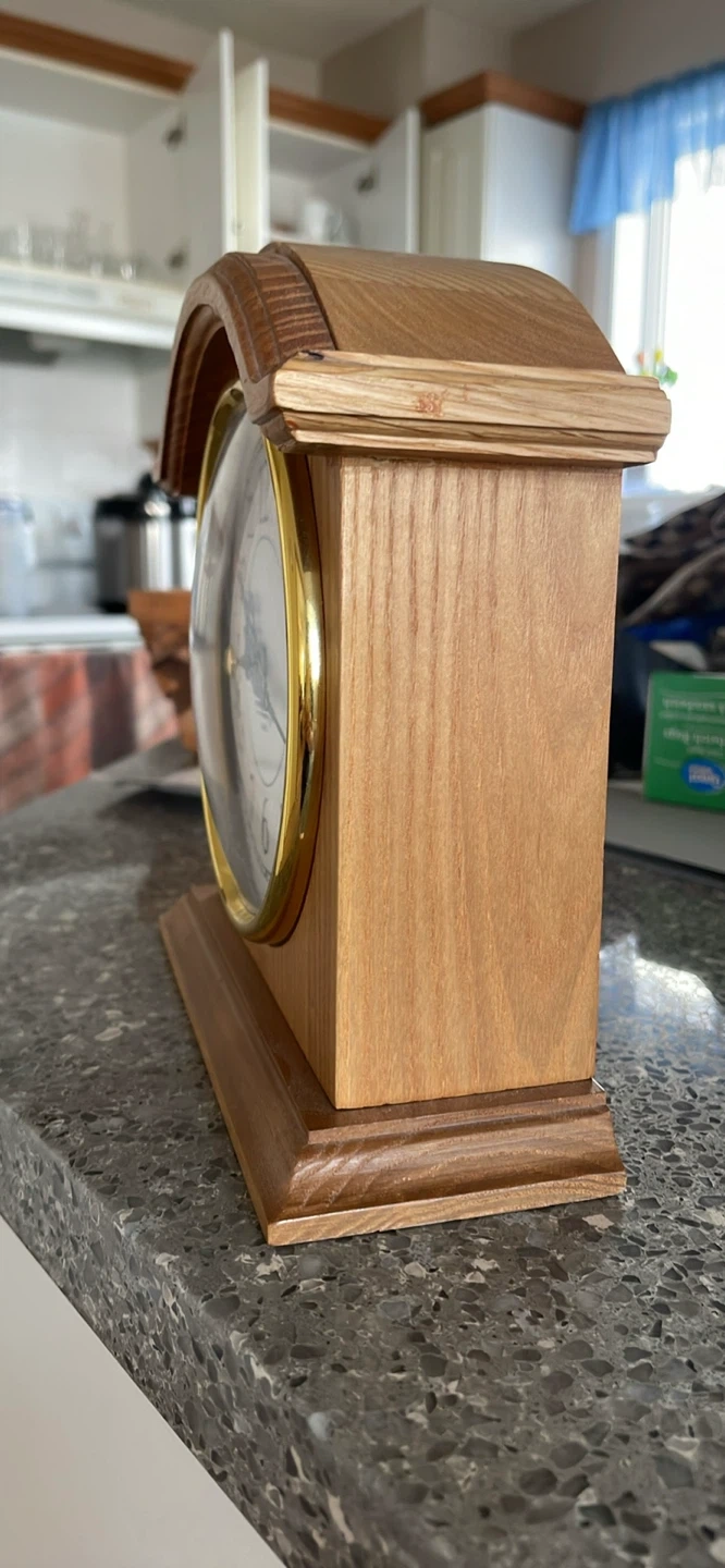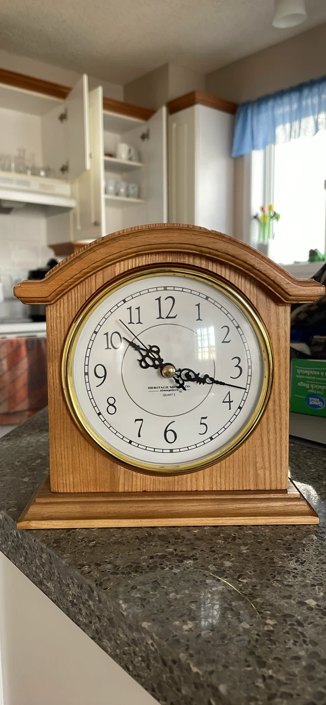 A classic "Hearthstone" mantel clock from Heritage Mint. It features a wooden case and a quartz movement for accurate timekeeping. A AA battery is required for operation.