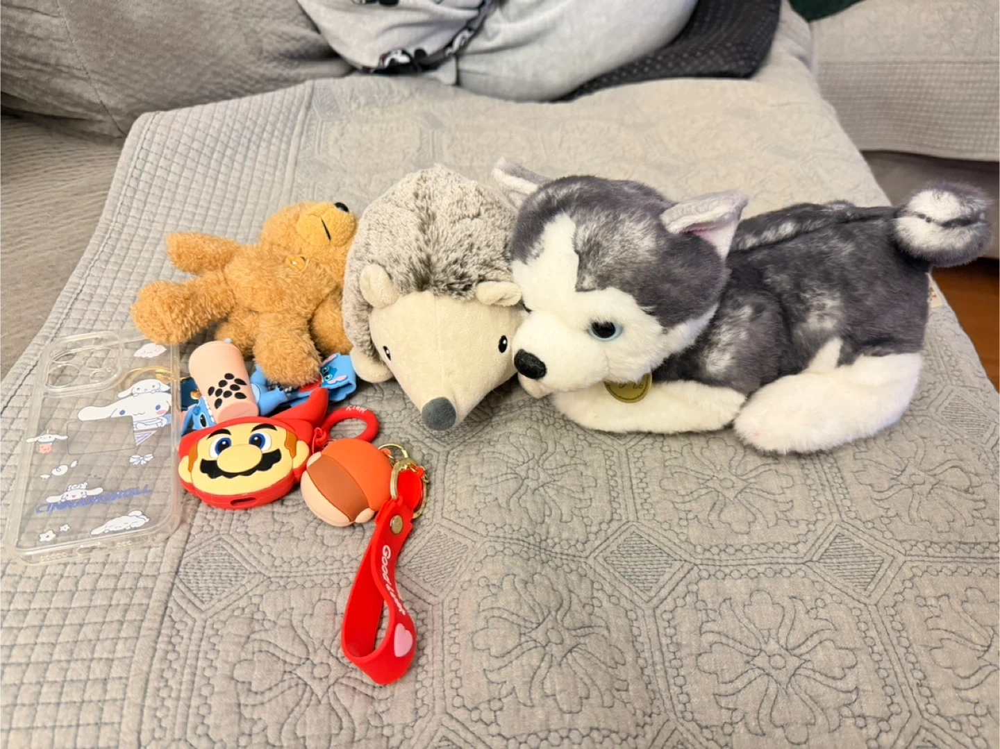 Collection includes a husky plush, hedgehog plush, teddy bear, and a Cinnamoroll themed phone case. Items are clean and ready for a new home! Perfect for any fan of cute characters.