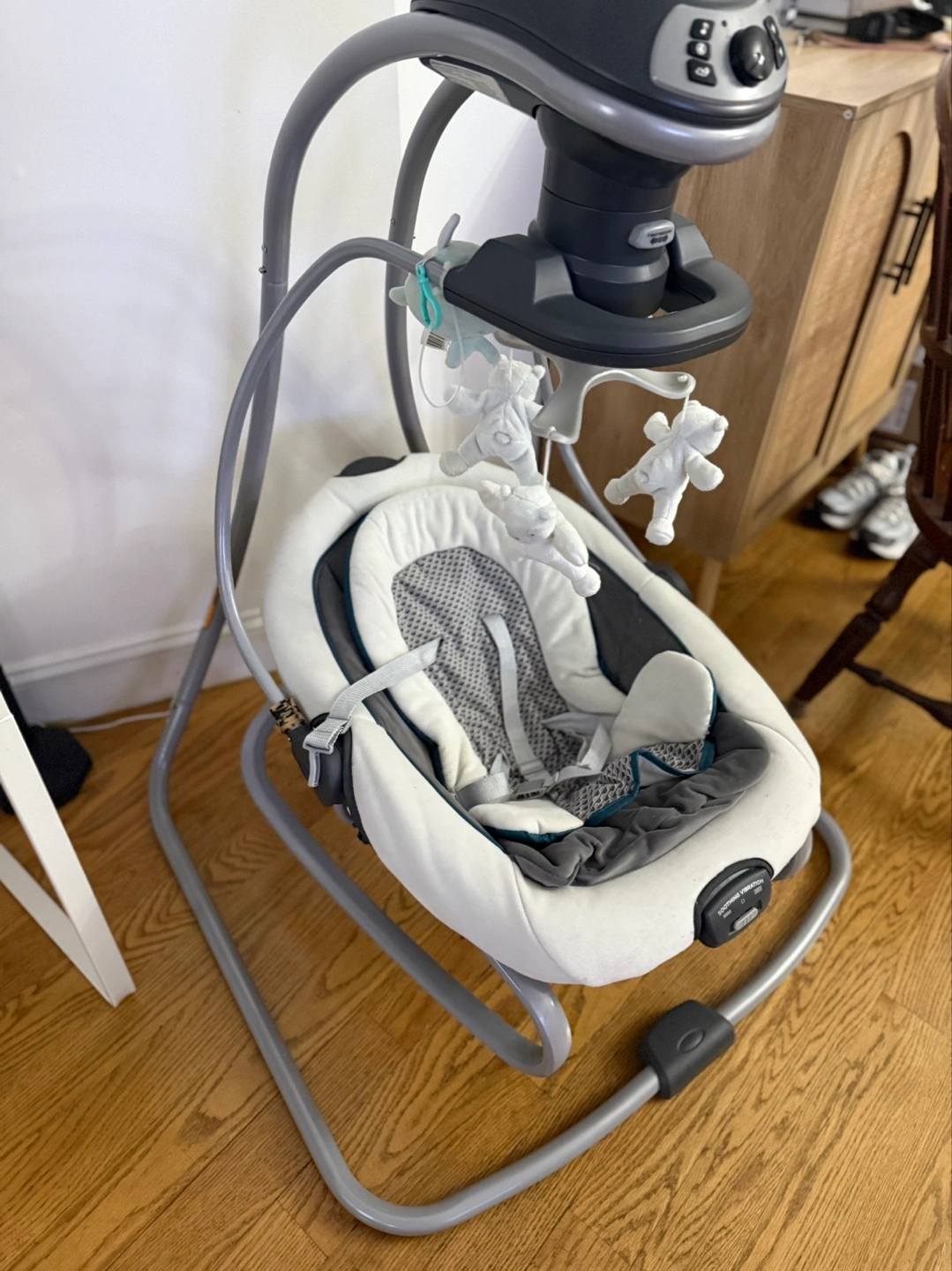 Baby swing, gray and white. Features multiple swing speeds and soothing vibrations. Includes mobile with plush toys. Great for calming baby.