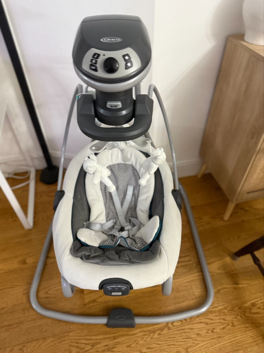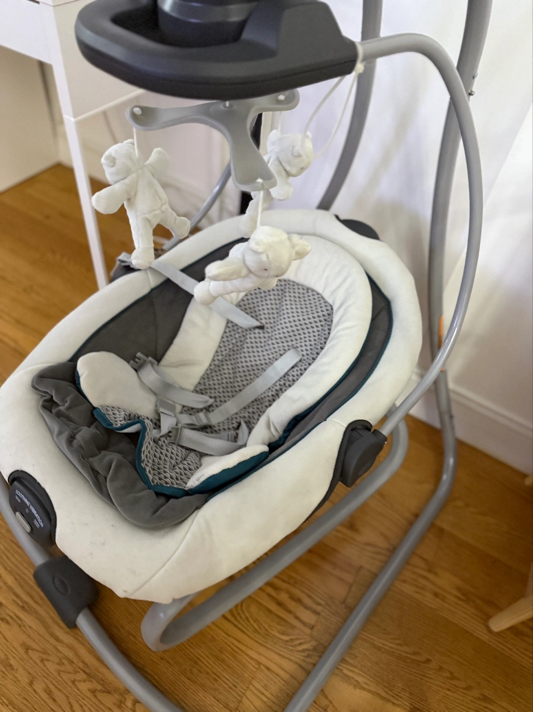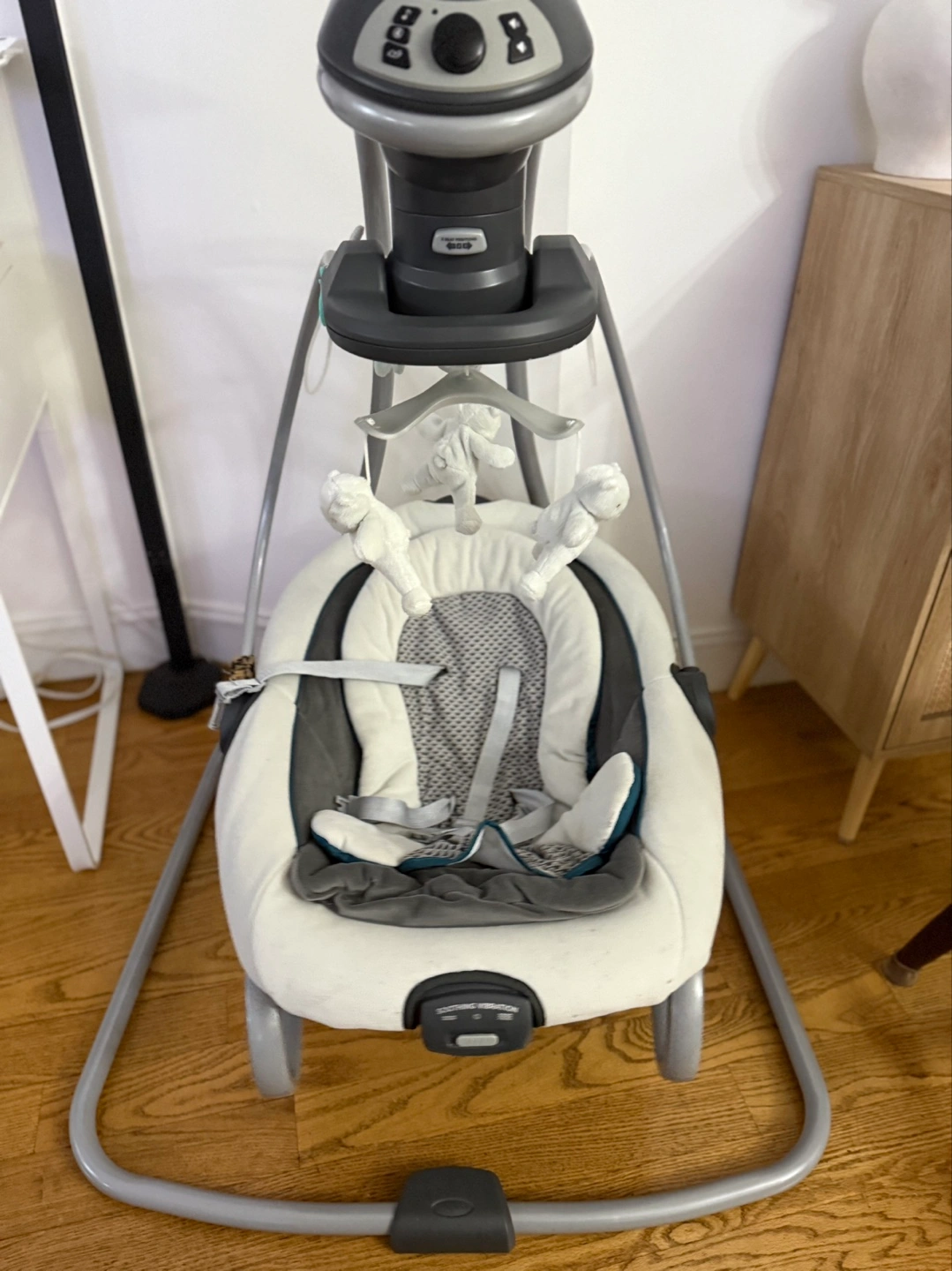 Baby swing, gray and white. Features multiple swing speeds and soothing vibrations. Includes mobile with plush toys. Great for calming baby.