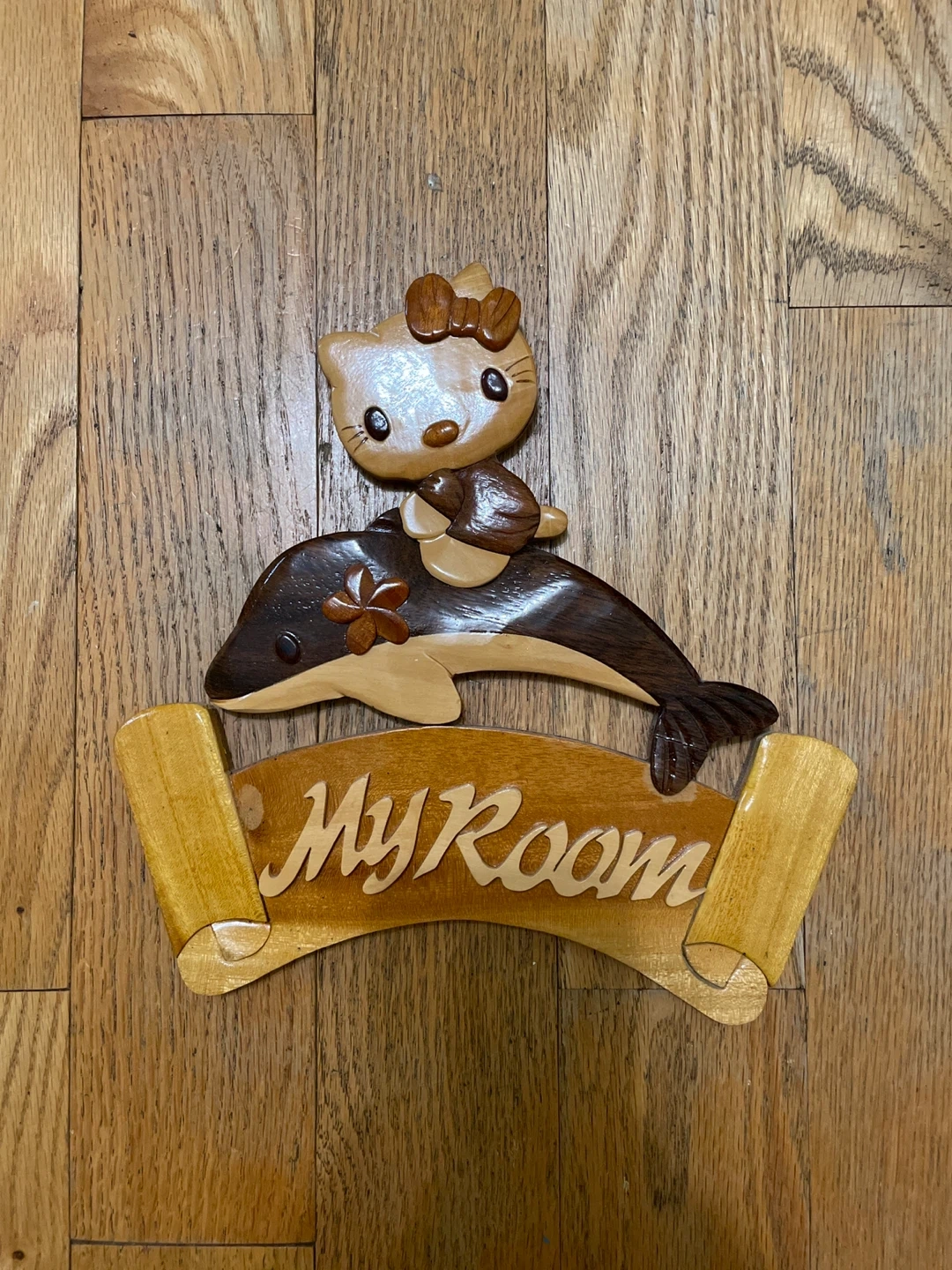 A cute wooden sign that says "My Room" with Hello Kitty riding a dolphin design. Can be hung.