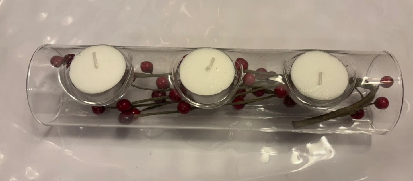 A clear glass tube candle holder designed to hold three tea lights. It's decorated with faux red berries and branches, giving it a festive look. This holder adds a cozy glow to any space!