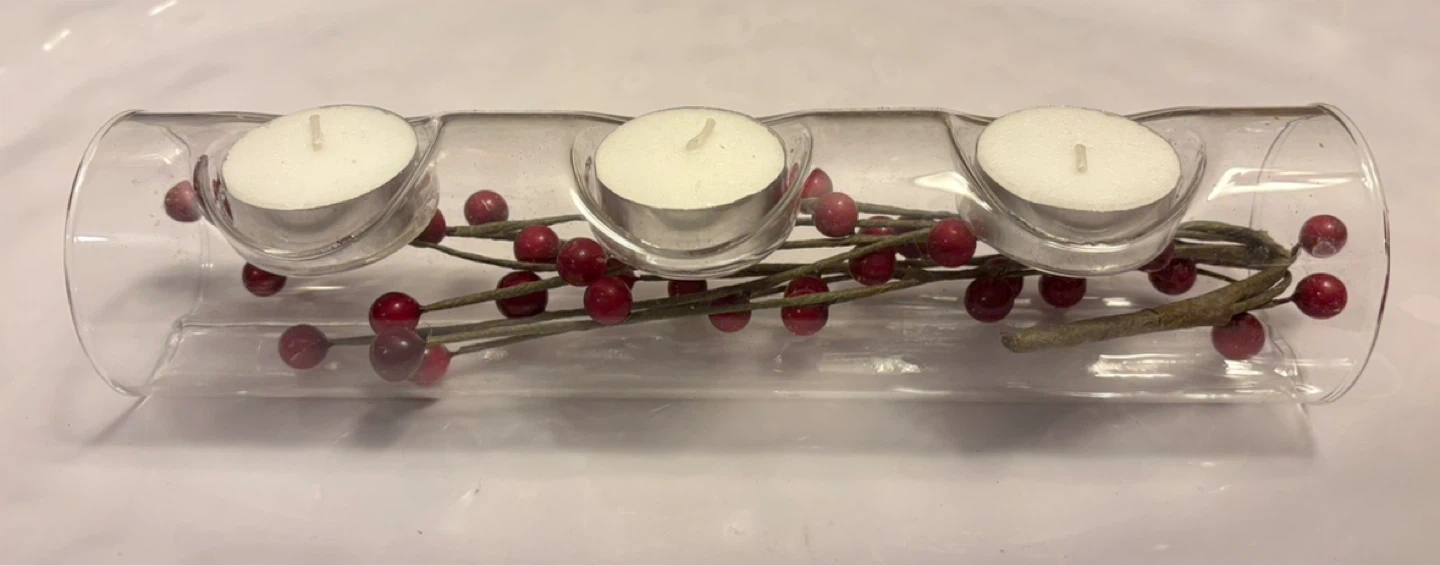 A clear glass tube candle holder designed to hold three tea lights. It's decorated with faux red berries and branches, giving it a festive look. This holder adds a cozy glow to any space!