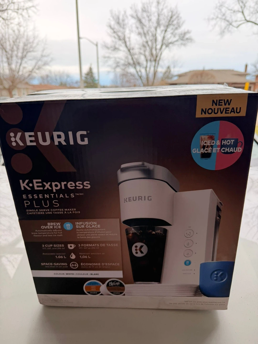 Brew iced or hot coffee with this Keurig K-Express Essentials Plus single-serve coffee maker. It offers three cup sizes: 177, 237, and 296 ml. The reservoir is removable and holds 1.06 L. It's space-saving, less than 17 cm wide.