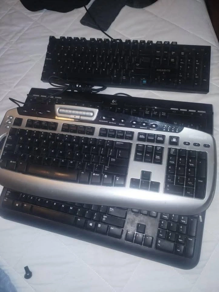 Offering an assortment of computer keyboards including brands like Gigabyte, Logitech and Microsoft, all in used condition, perfect for spare parts or basic use. Variety of Brands: Mix of Gigabyte, Logitech, and Microsoft keyboards. Condition: Used, showing signs of wear and tear. Connectivity: Standard wired.