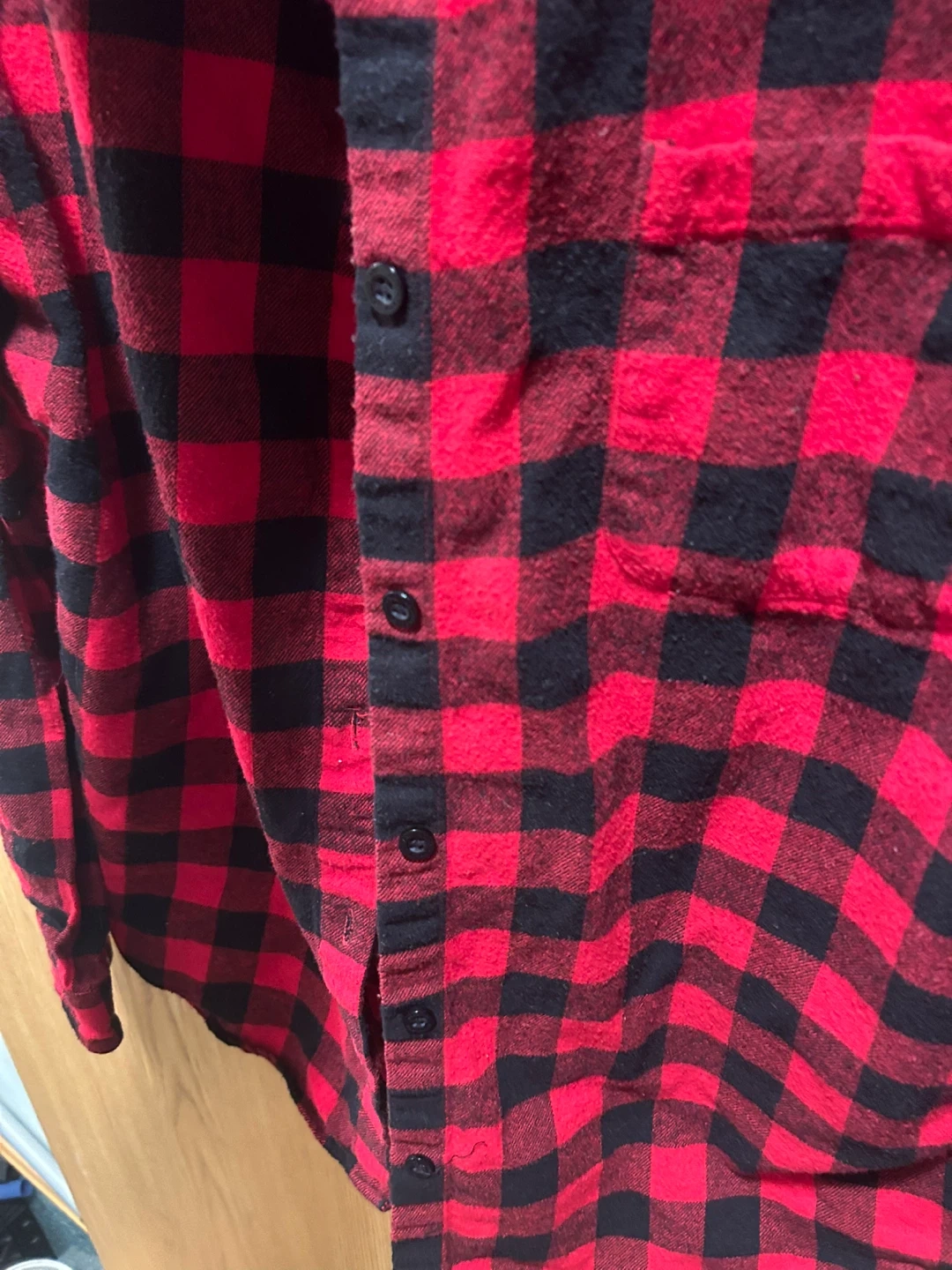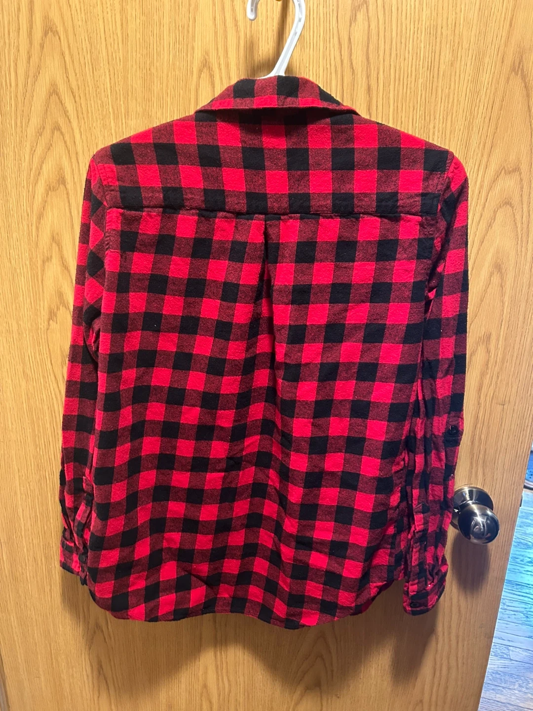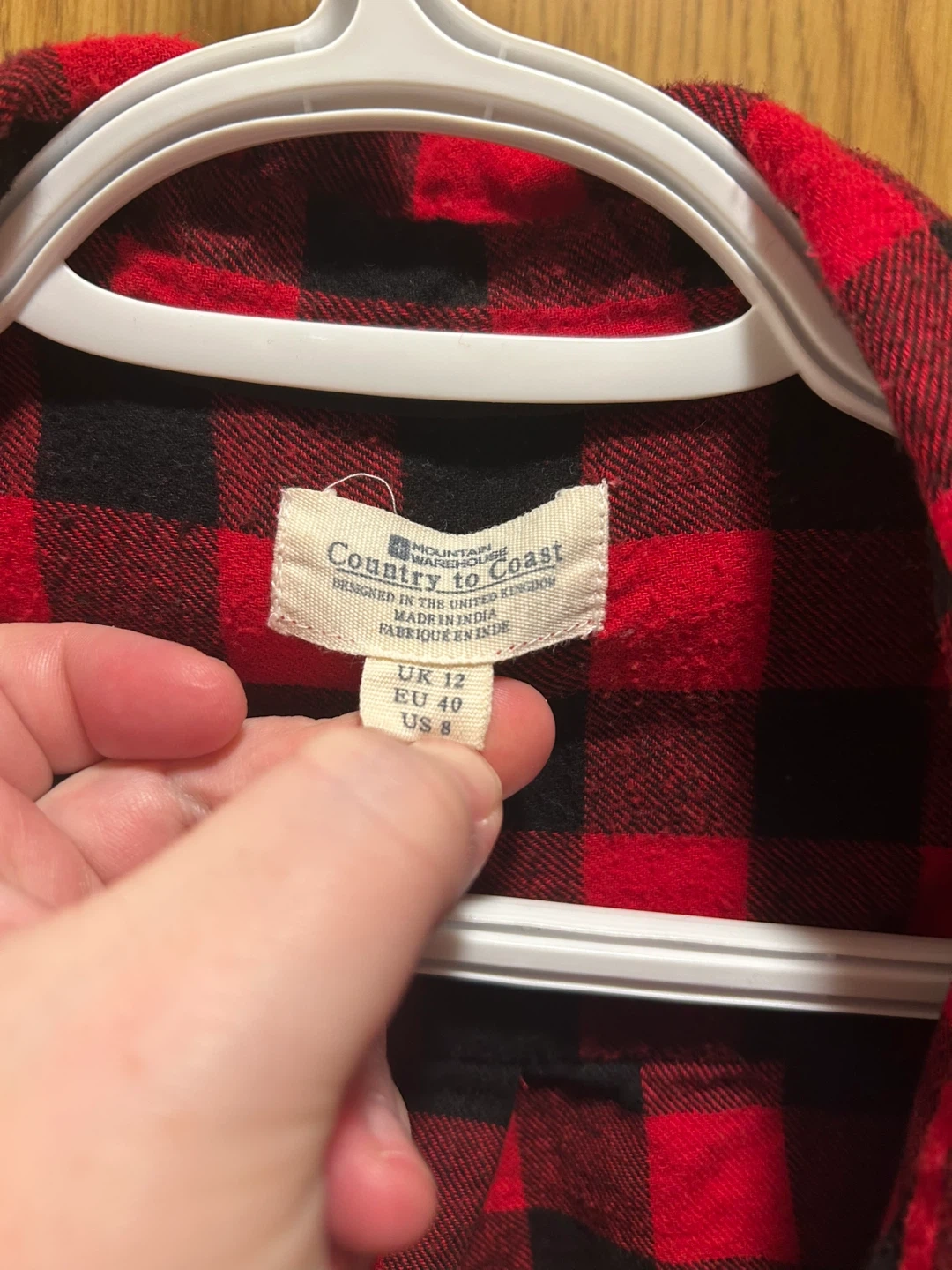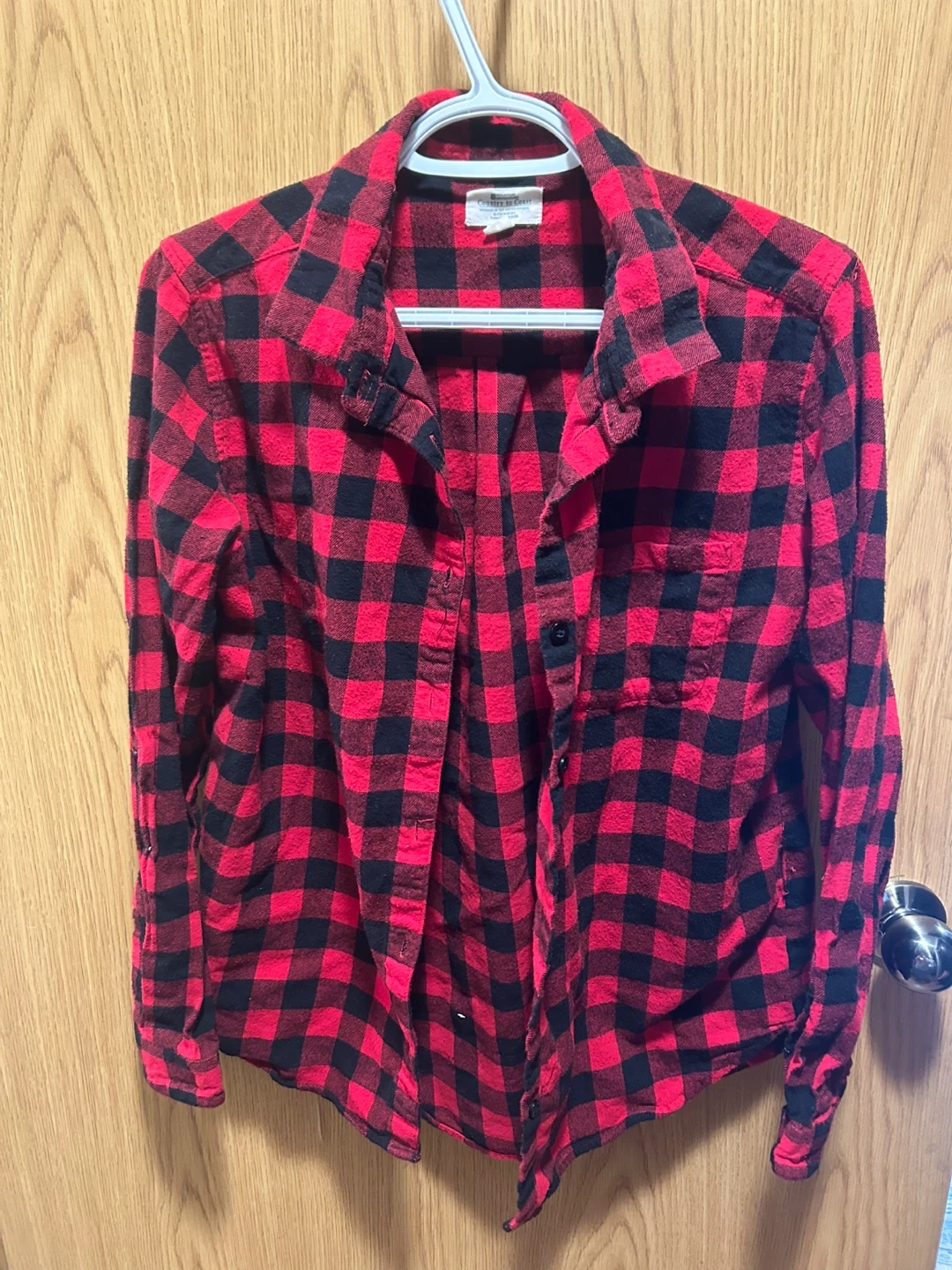 This red and black plaid flannel shirt is from Country to Coast. It's a size US 8. The material feels soft and is suitable for layering.