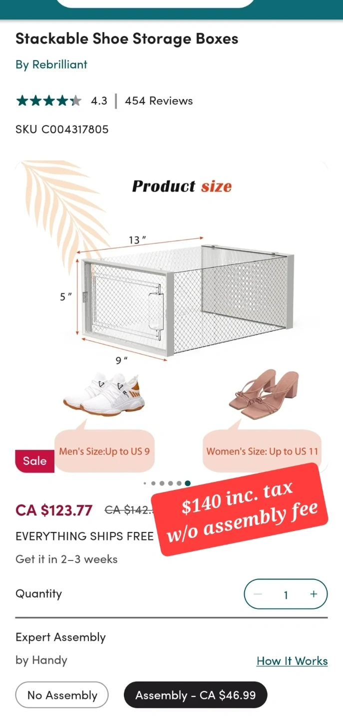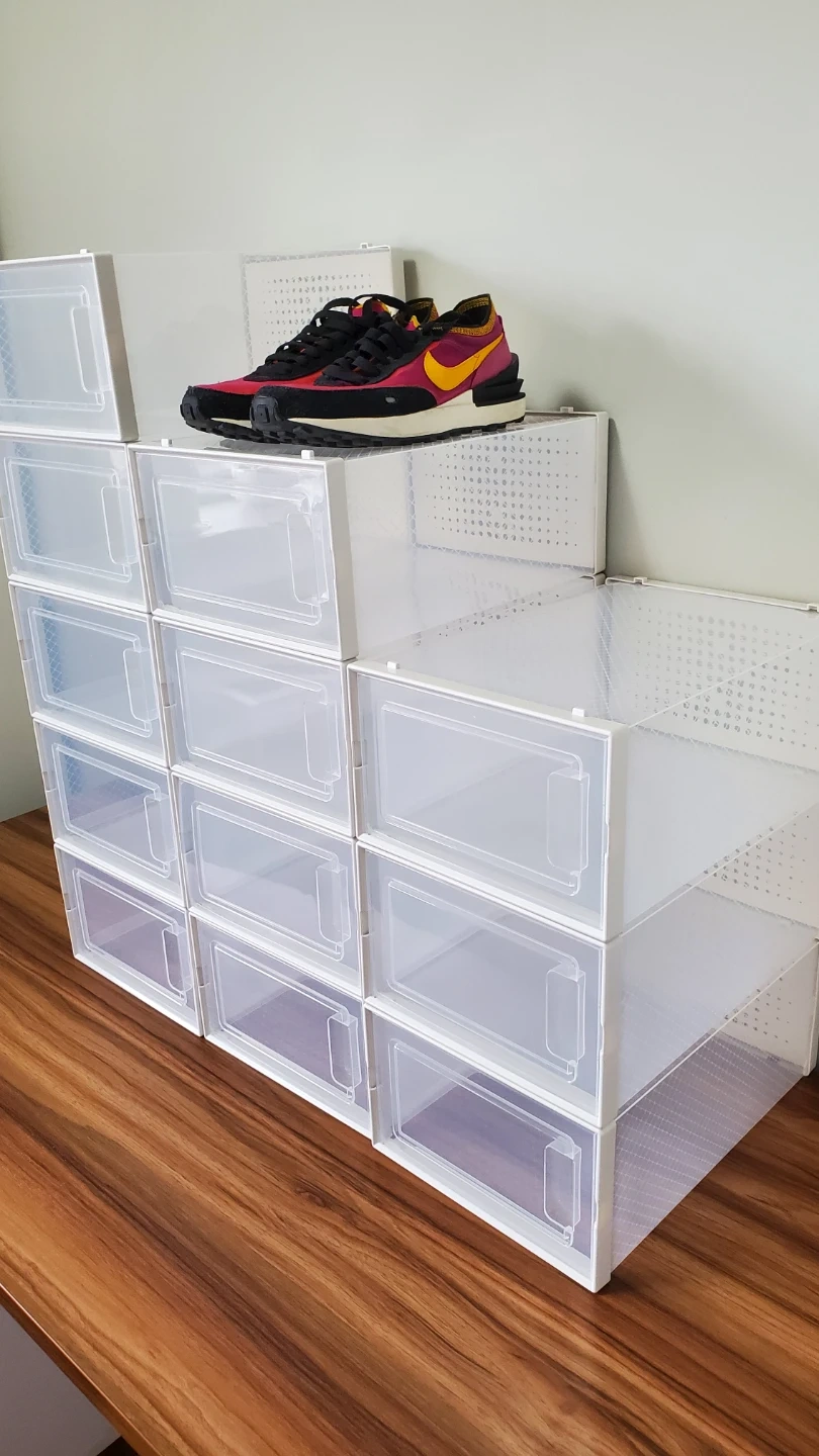 This 12-pack of shoe storage boxes are brand new and can be used to organize shoes, clothes, cosmetics, etc. They're still in a box but should be easy to assemble. The black translucent design allows you to see what's inside. The boxes can hold weight, and they are stackable to each other. Each one has a medium size (my sample shoe is 9.5 mens, but women's shoes will even fit more), and you can see dimensions in one of my photos. Max is size approximately 12. Please don't ask for a lower price (see orig price $140 ) so save $$.