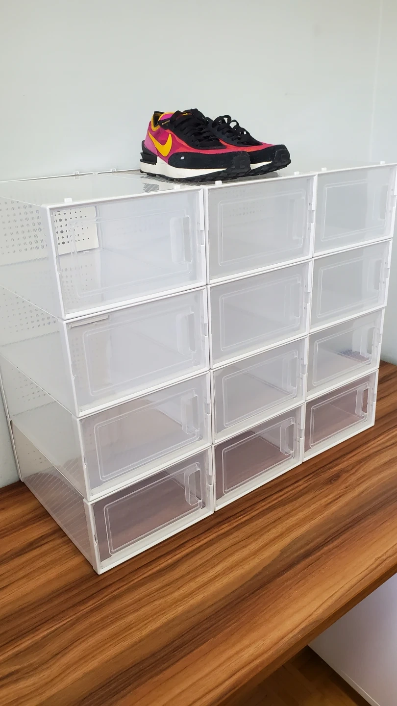 This 12-pack of shoe storage boxes are brand new and can be used to organize shoes, clothes, cosmetics, etc. They're still in a box but should be easy to assemble. The black translucent design allows you to see what's inside. The boxes can hold weight, and they are stackable to each other. Each one has a medium size (my sample shoe is 9.5 mens, but women's shoes will even fit more), and you can see dimensions in one of my photos. Max is size approximately 12. Please don't ask for a lower price (see orig price $140 ) so save $$.