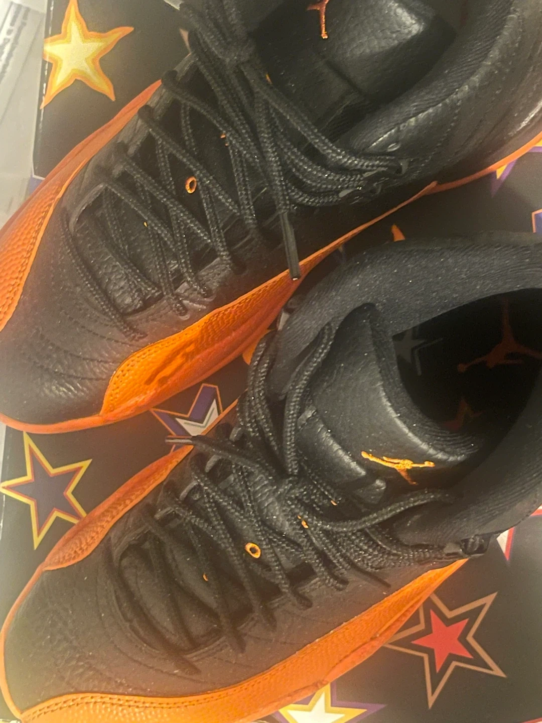 These are Jordan 12 "The Master" sneakers in a black and orange colourway. The shoes come with the original box. The "23" is visible on the heel, a classic Jordan branding detail.