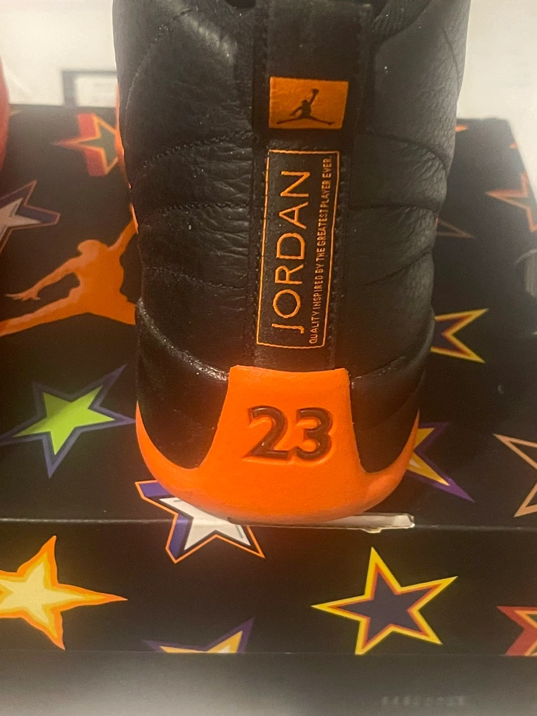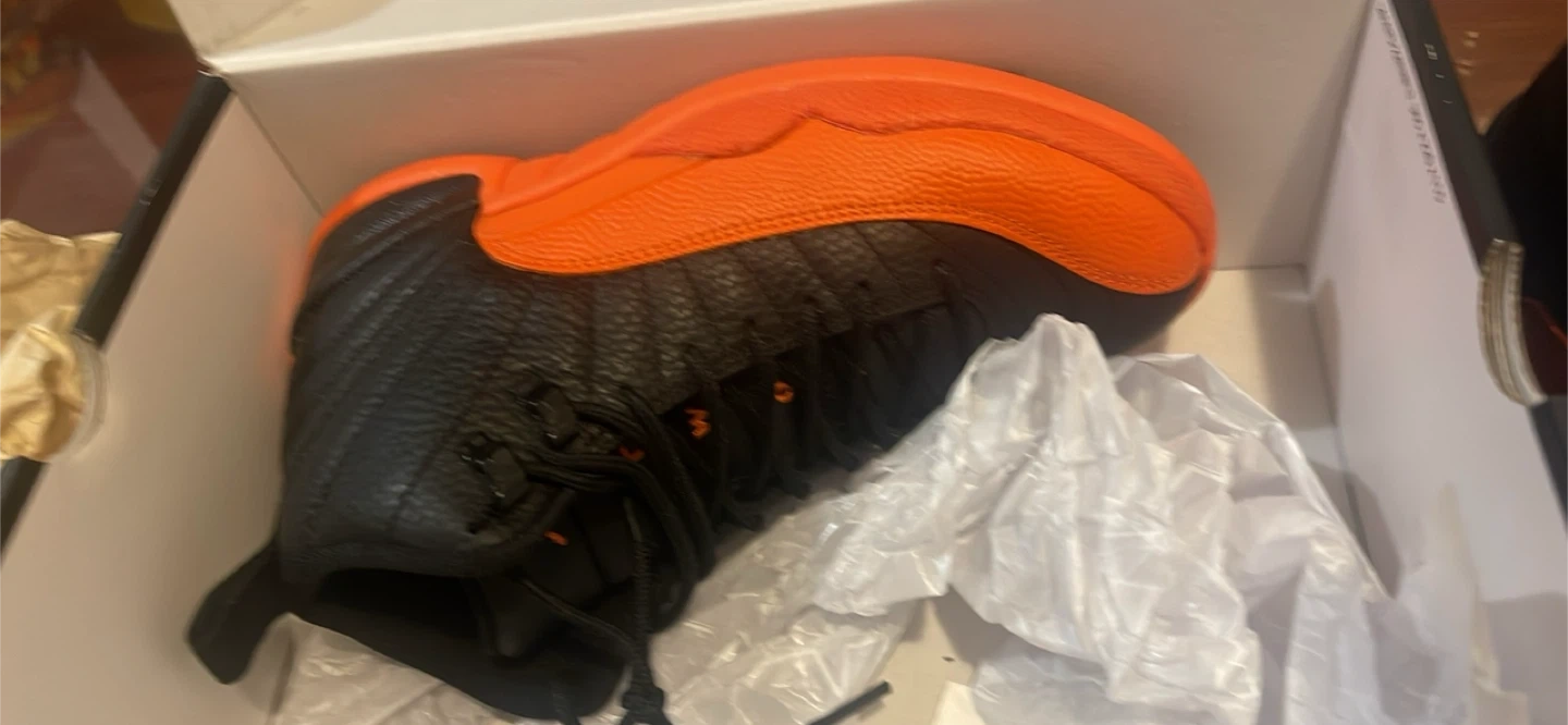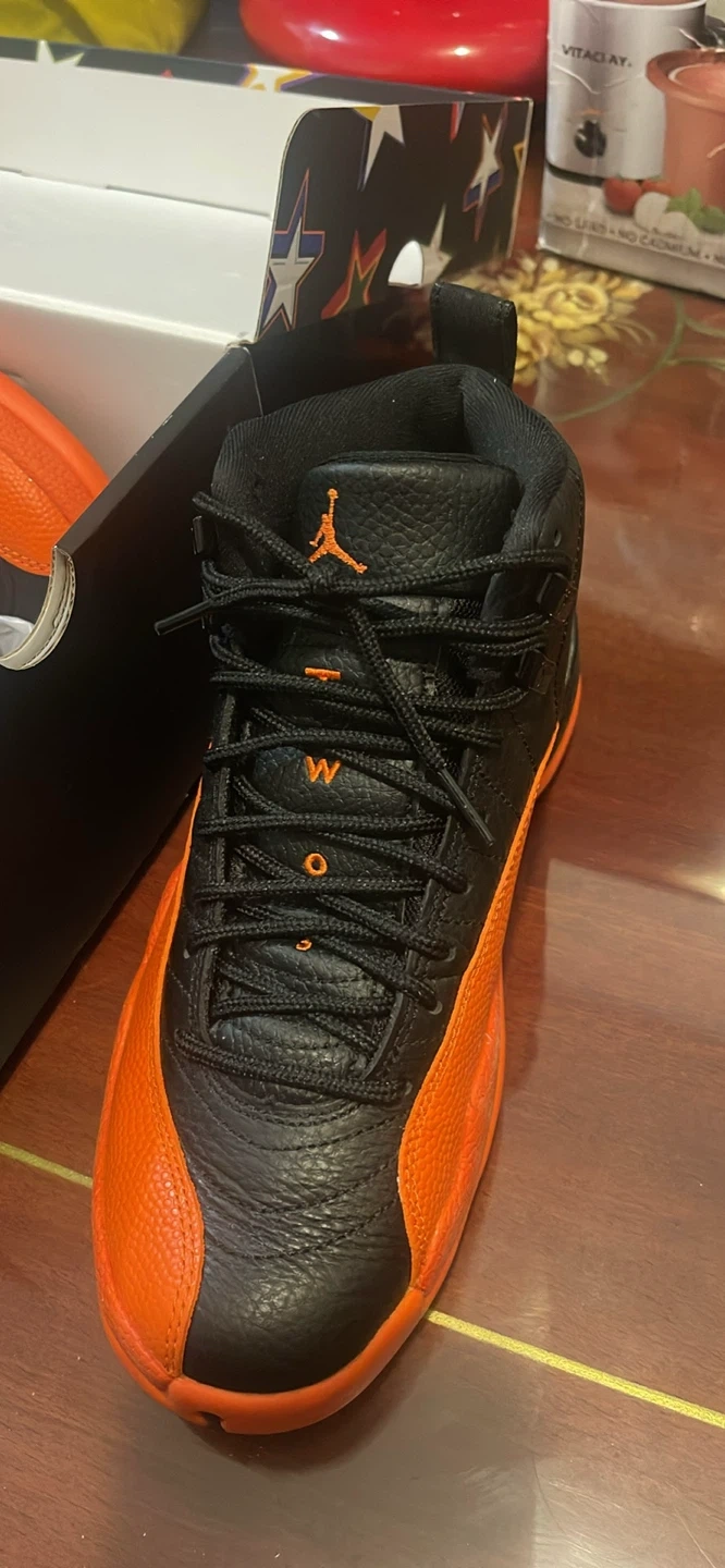 These are Jordan 12 "The Master" sneakers in a black and orange colourway. The shoes come with the original box. The "23" is visible on the heel, a classic Jordan branding detail.