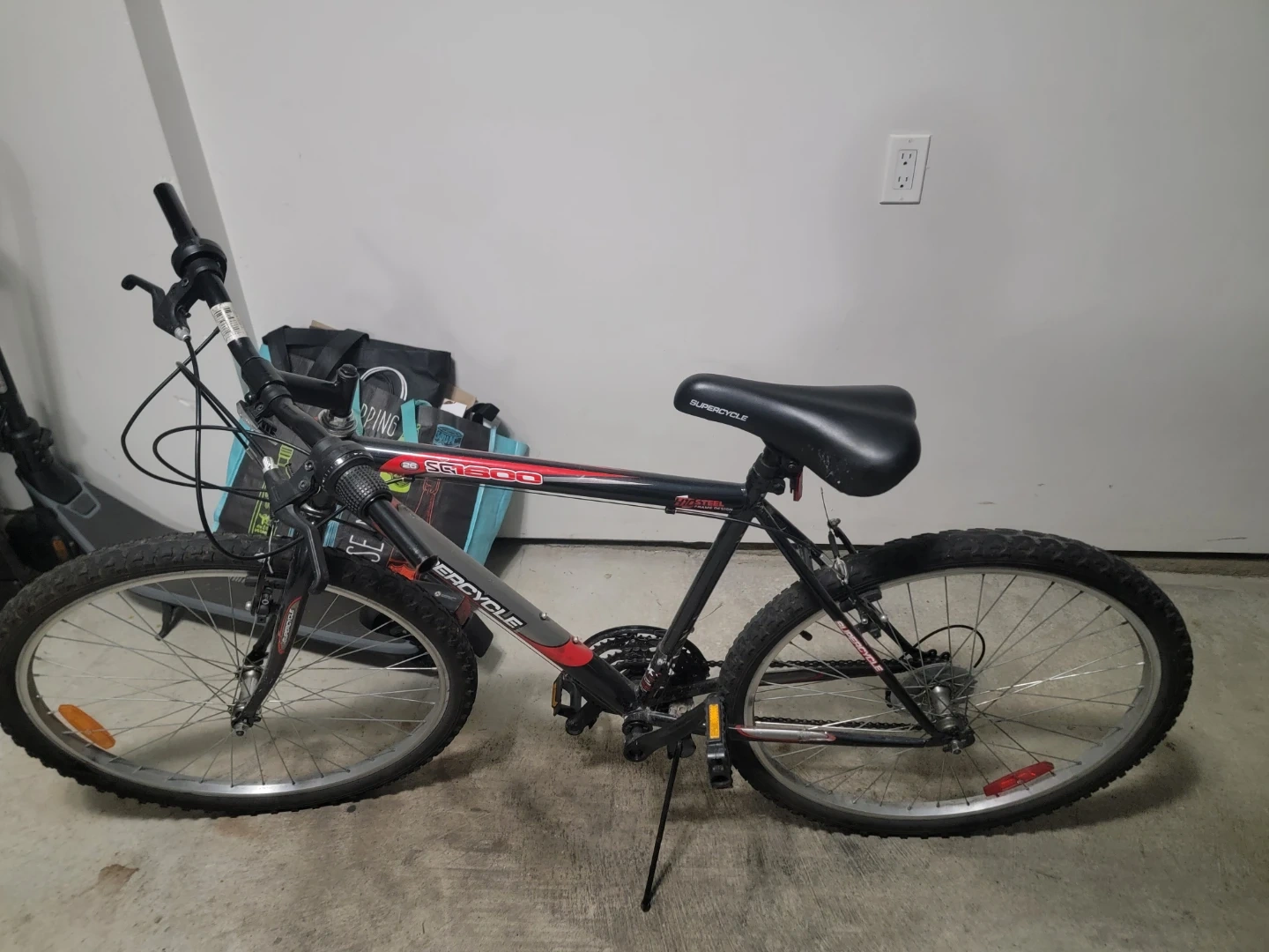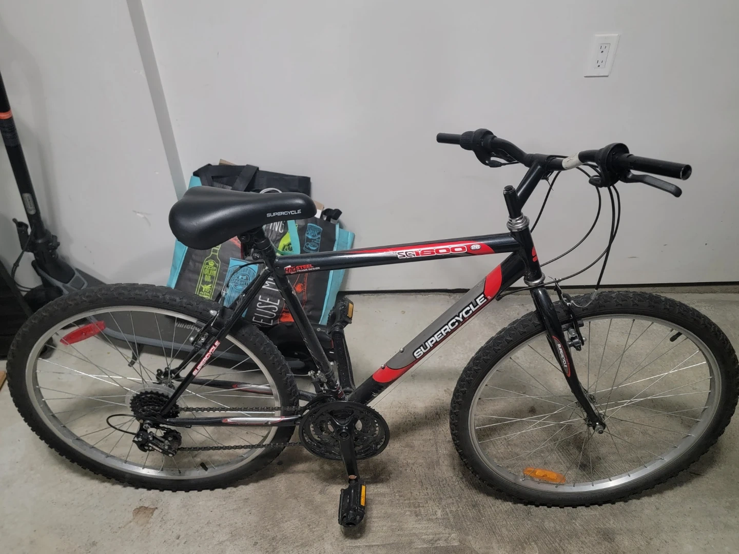 SUPERCYCLE SG600 mountain bike in black and red. It's a sturdy bike for off-road adventures. Perfect for commuting or hitting the trails!