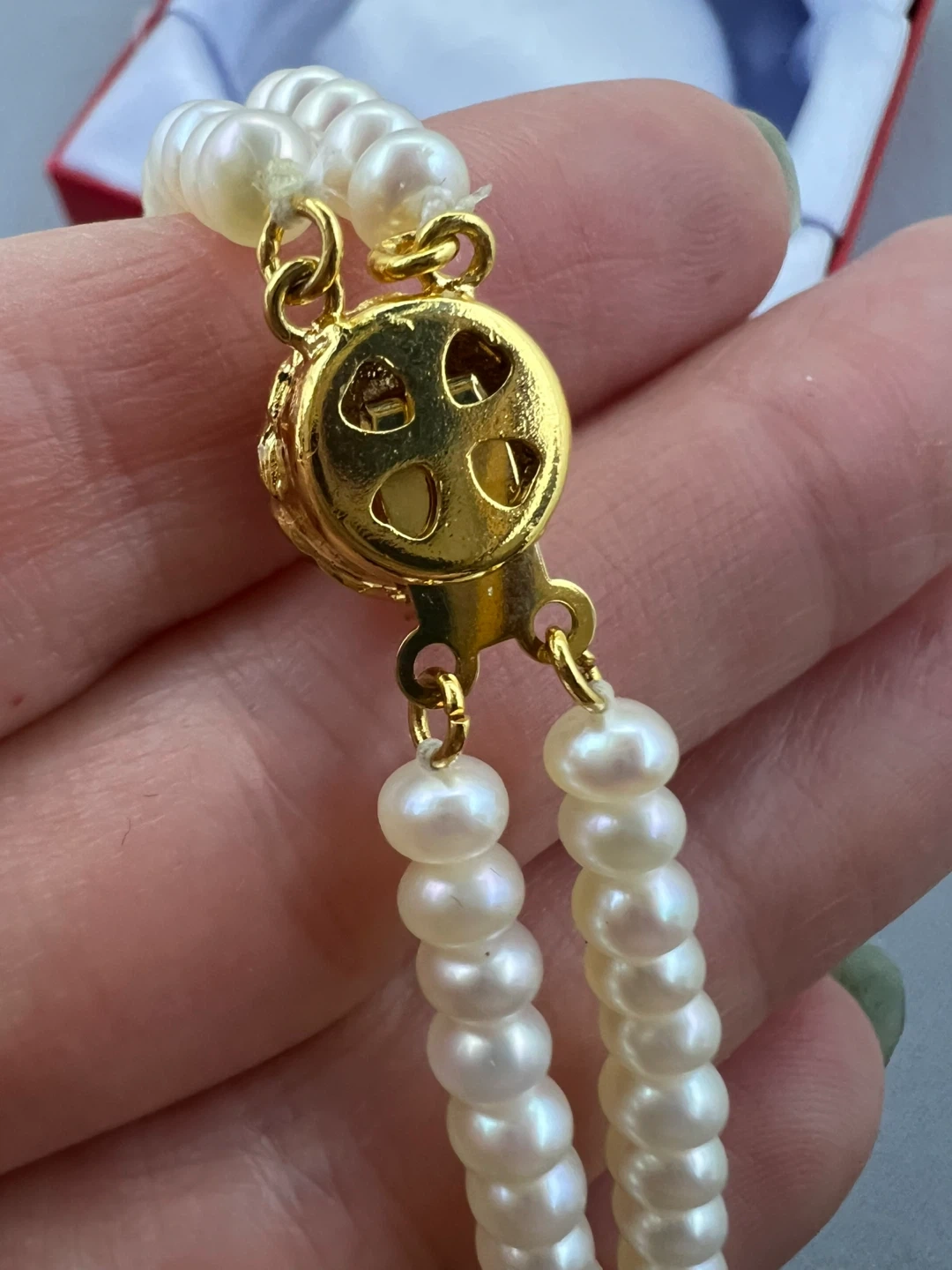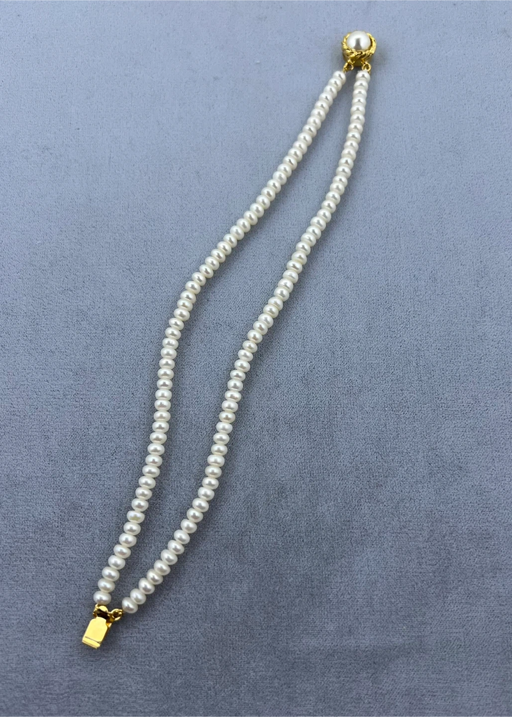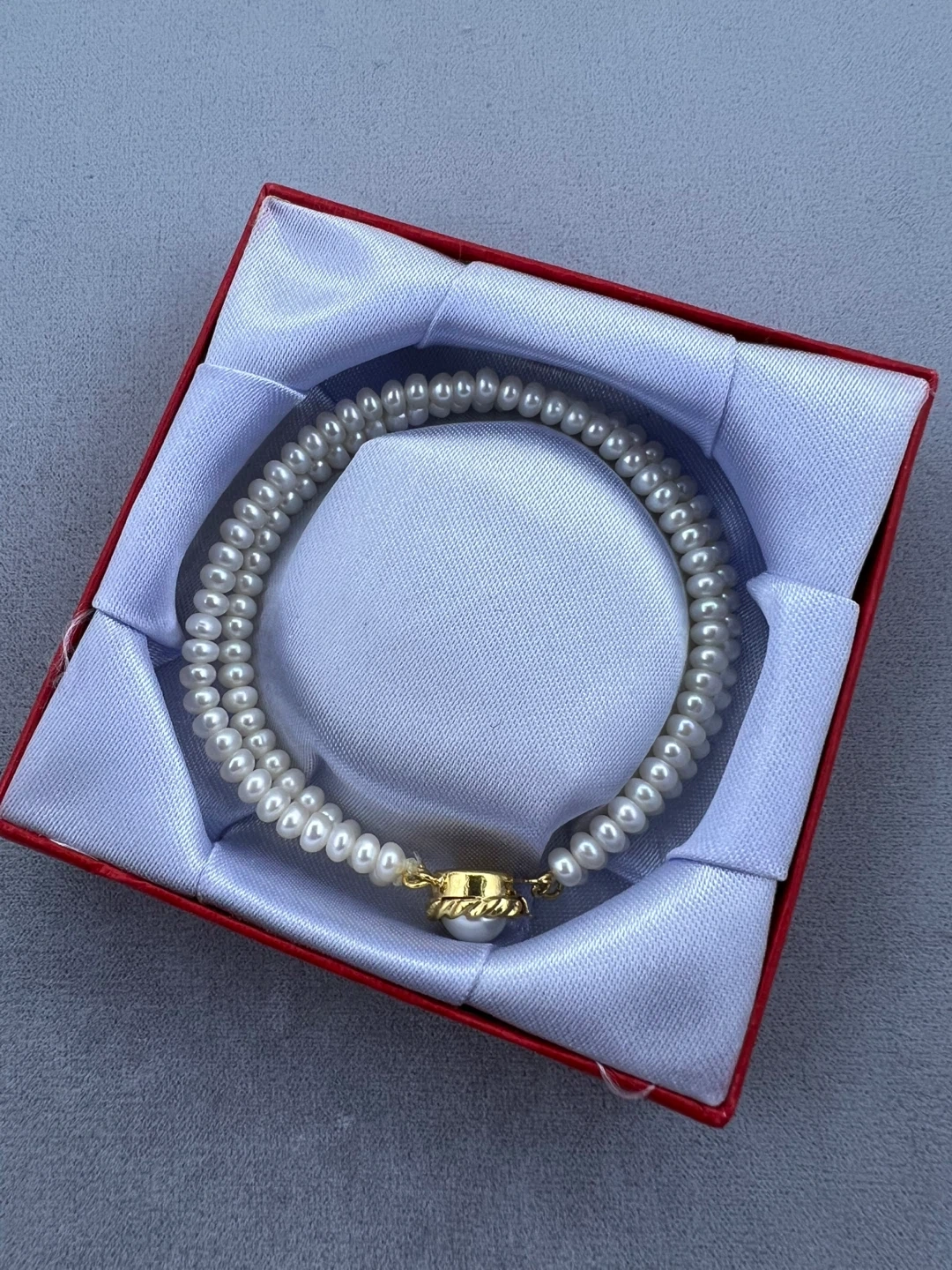 Two rows of luminous and uniform white pearls, offering a rich and layered look that effortlessly transitions from daytime chic to evening glamour