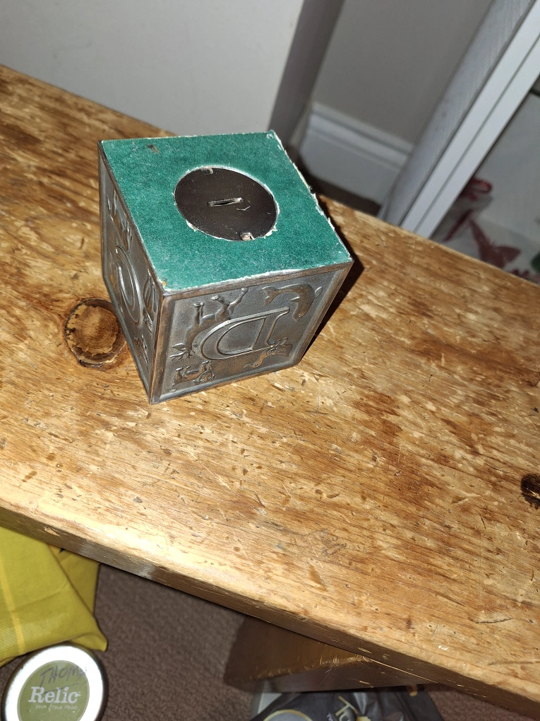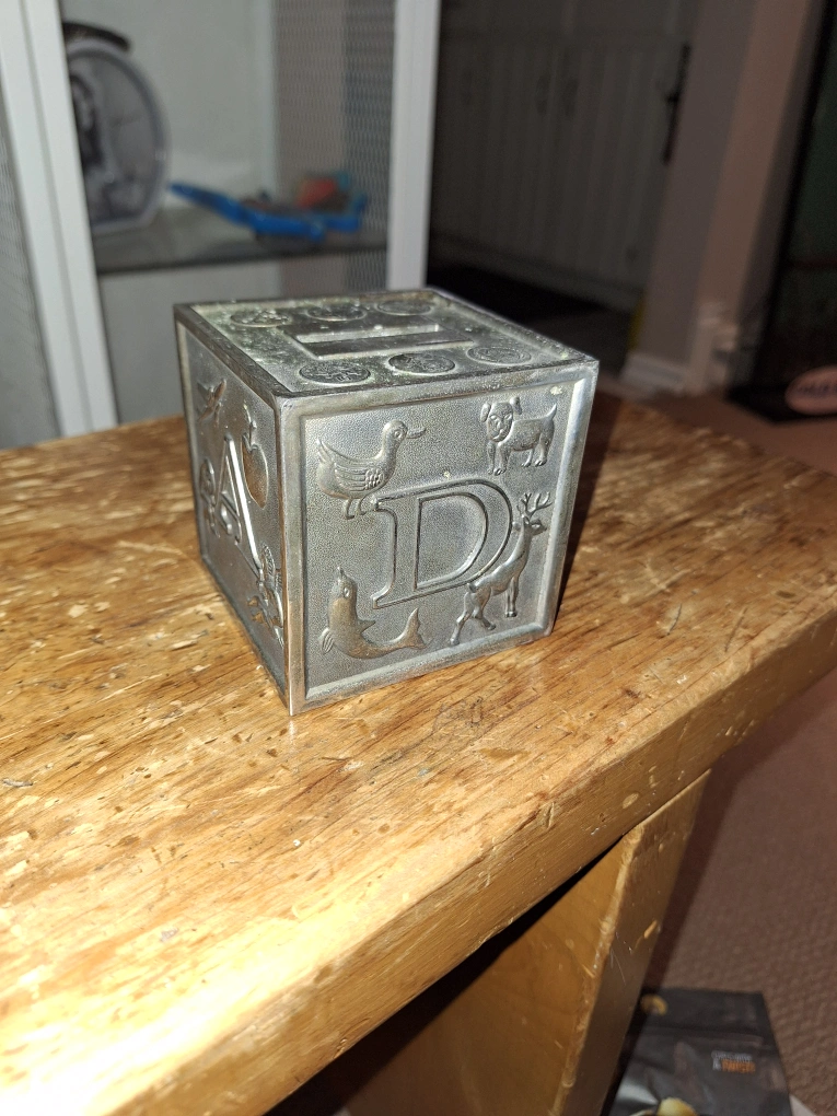 Selling a vintage coin bank shaped like an alphabet block! It features ABC letters and different animals. It would make a great addition to any collection! A bit of silver cleaner is all that's needed to make it shine. PPU/Pick up Lakeshore and Kipling Ave