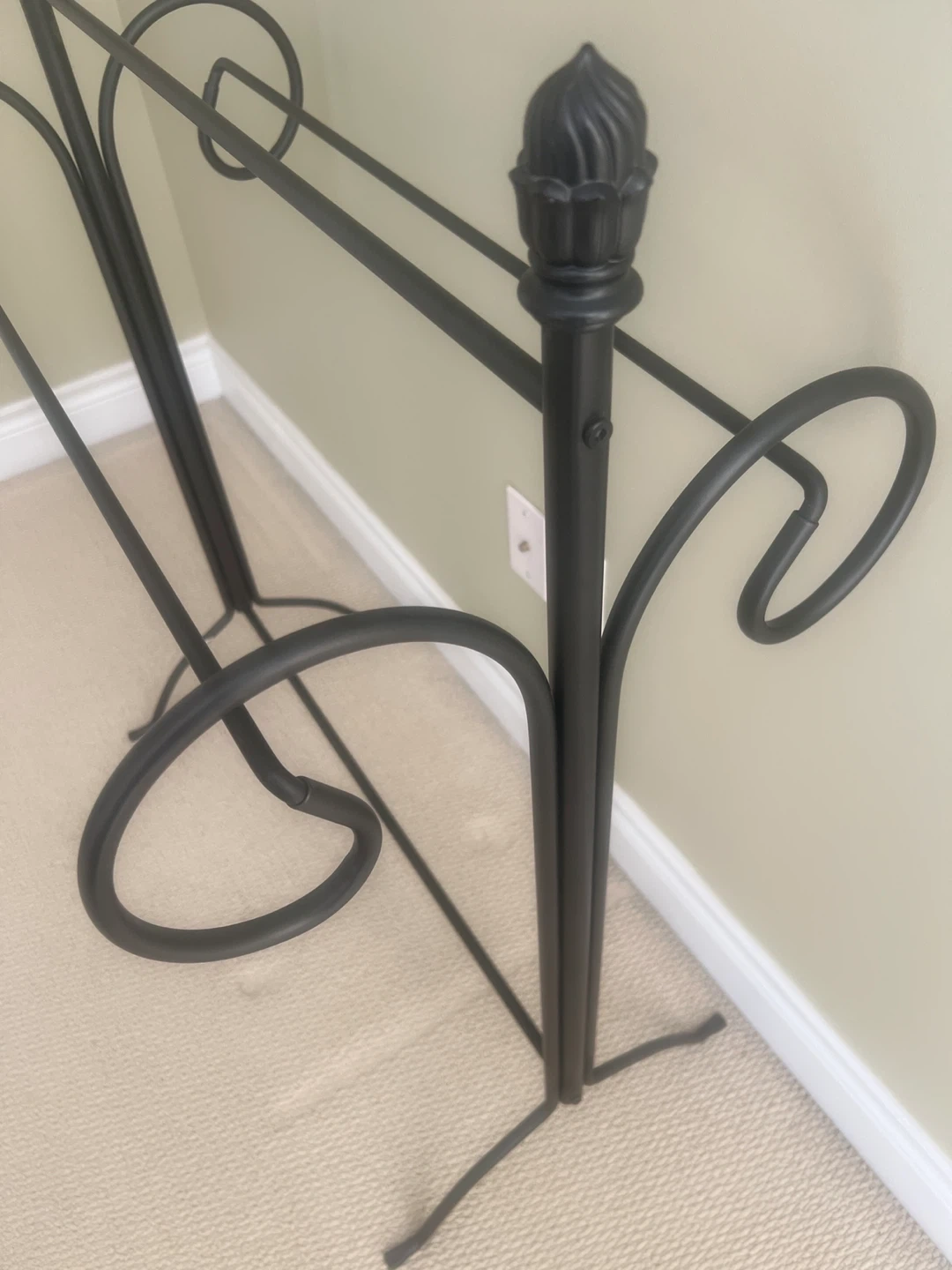 A black metal quilt rack with decorative scrollwork. It has three bars for hanging. Perfect for displaying blankets or quilts in your living space.