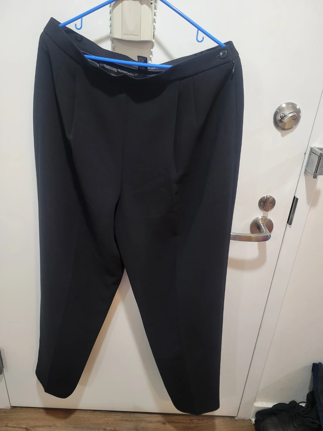 Calvin Klein black trousers. Made with a polyester blend. These pants have a flat front with a hidden zipper closure and side pockets. They feature a straight leg fit.