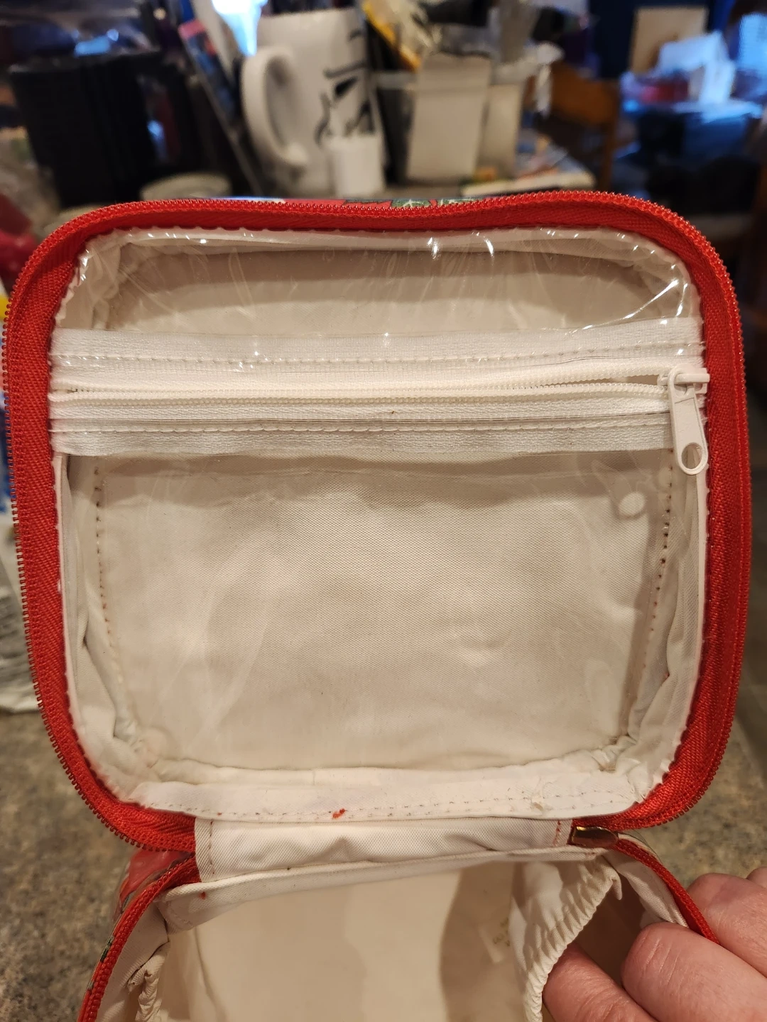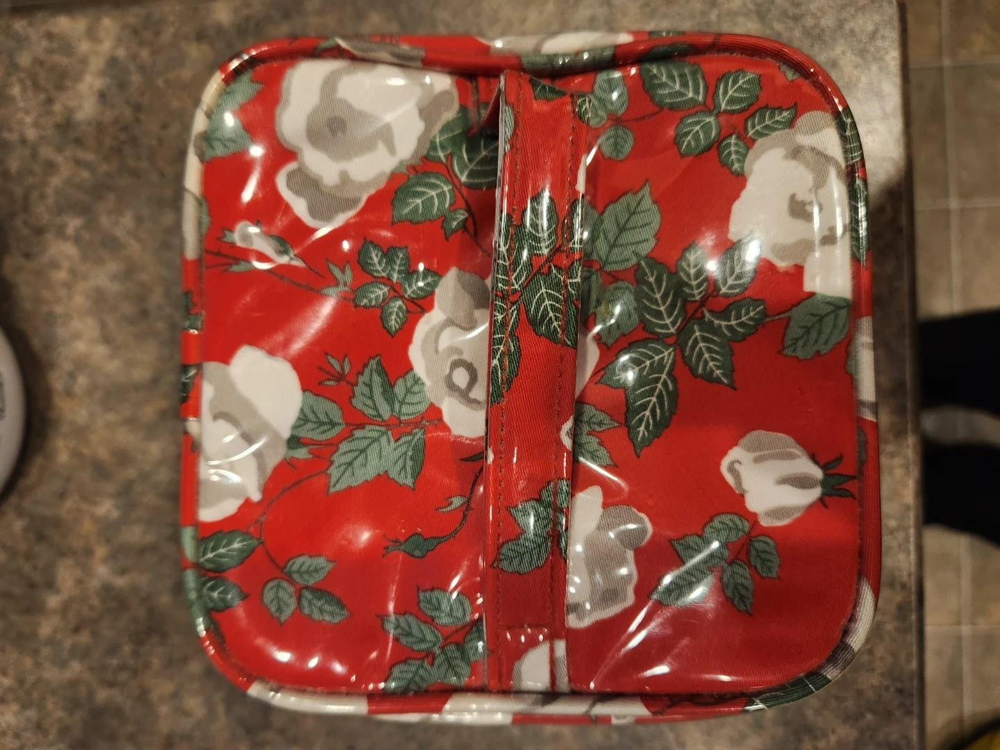 This vintage Kate Spade beauty bag has a floral red and white rose print. It features a main compartment with elasticated pockets and a zippered top pouch inside. It's made of a wipeable material, perfect for travel or everyday organization. Great for storing makeup and toiletries!