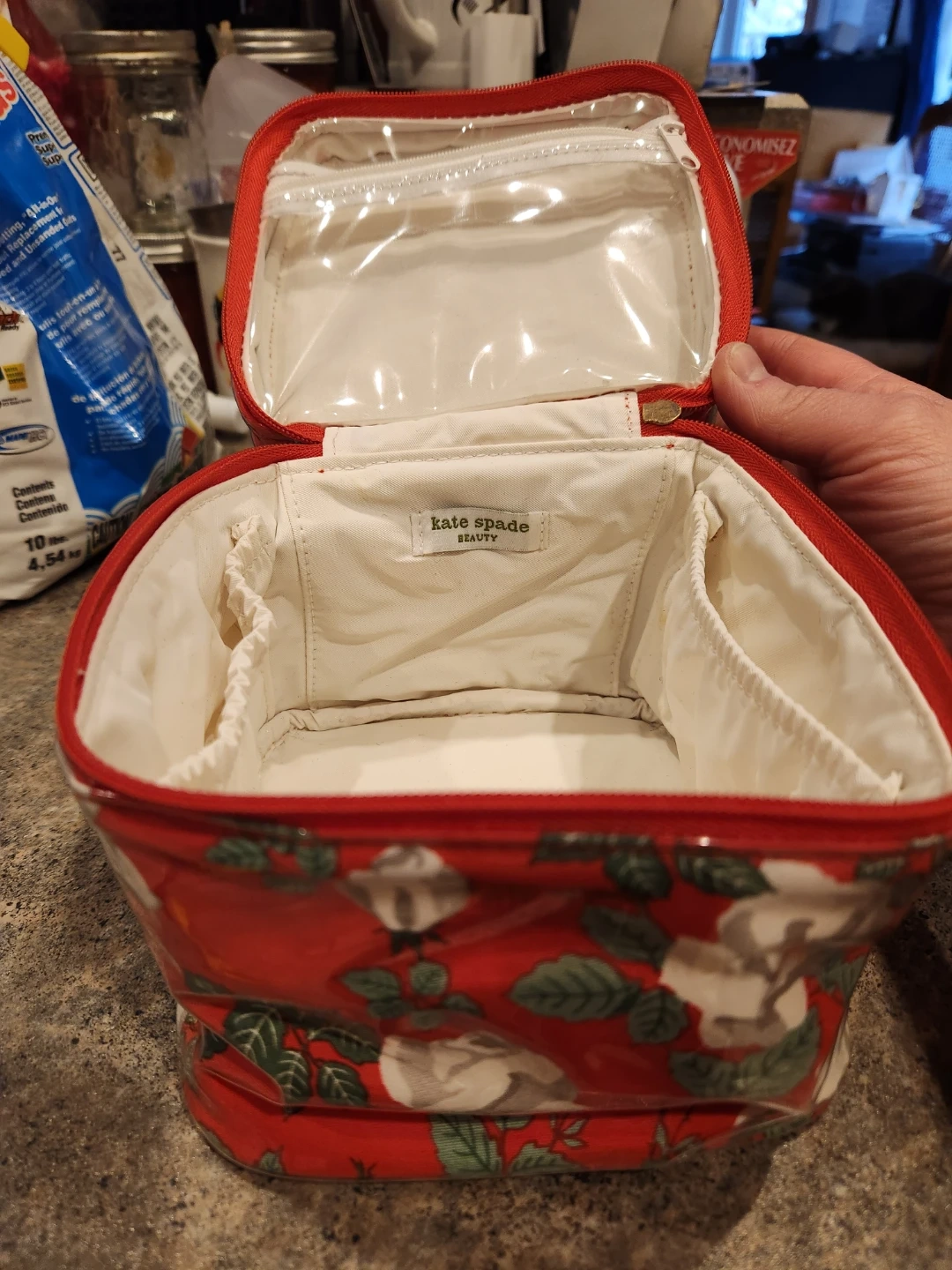 This vintage Kate Spade beauty bag has a floral red and white rose print. It features a main compartment with elasticated pockets and a zippered top pouch inside. It's made of a wipeable material, perfect for travel or everyday organization. Great for storing makeup and toiletries!