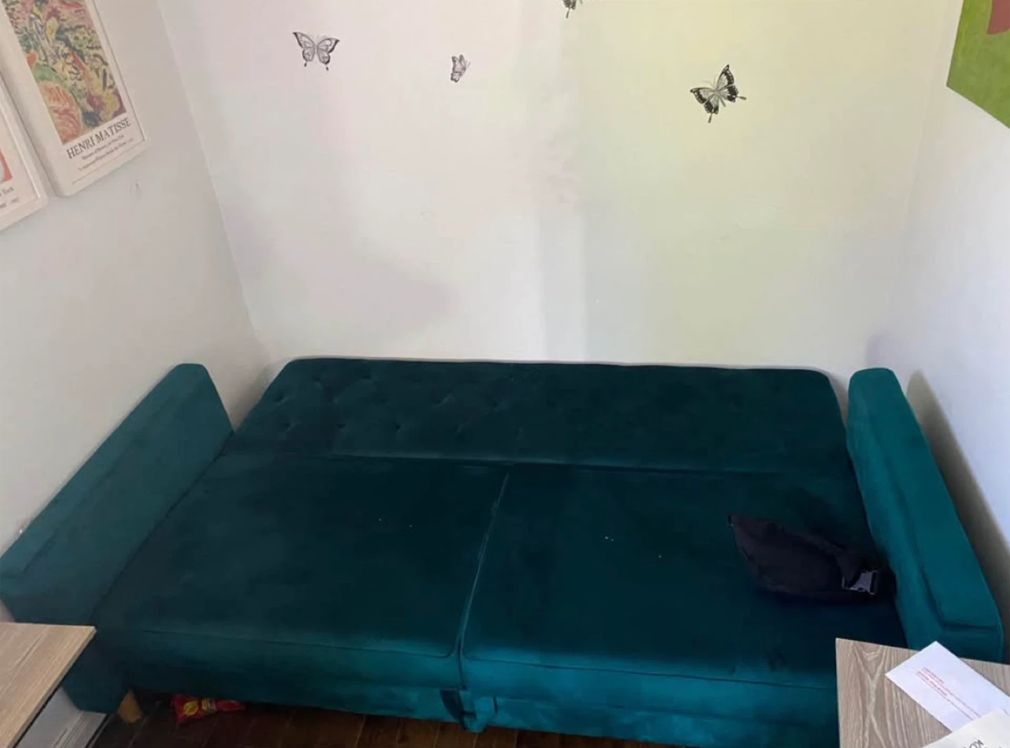 Teal velvet futon sofa bed with a stylish tufted design. Converts easily for seating or sleeping. Dimensions when open are 65" L x 41.5" W x 16" H. Seat depth is 22". Perfect for smaller living spaces or guest rooms! Some resin stains. Price negotiable. No delivery.