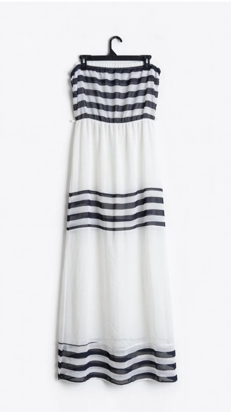 Strapless dress with horizontal black and white stripes.