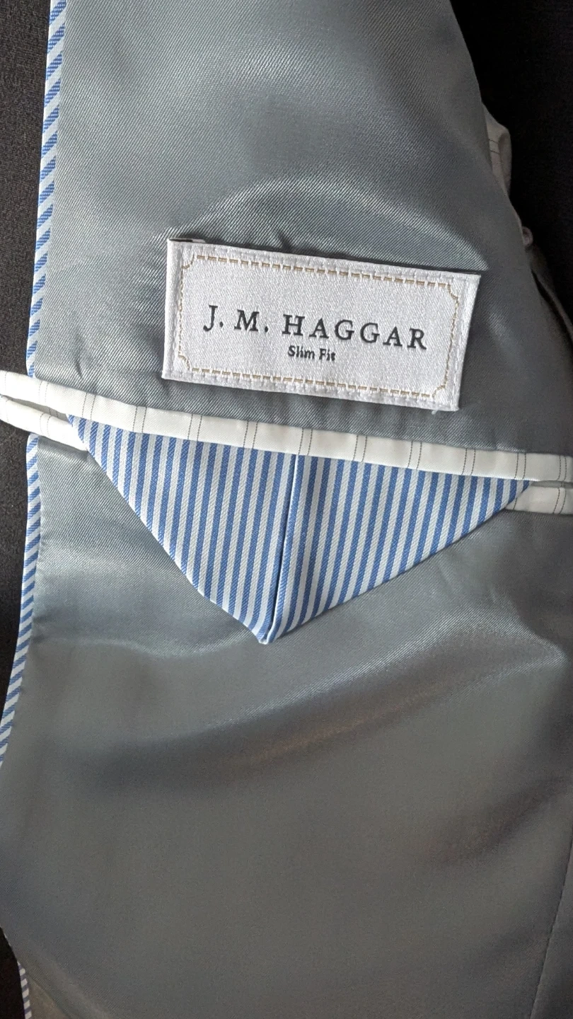 This J.M. Haggar suit set includes a black jacket and matching pants. It's a slim fit style, perfect for looking sharp. The jacket is made in Vietnam and requires dry cleaning.
