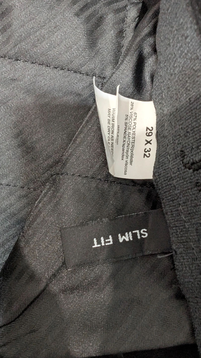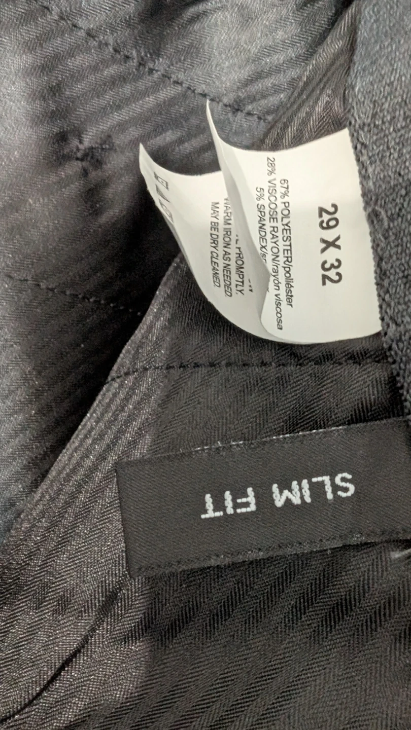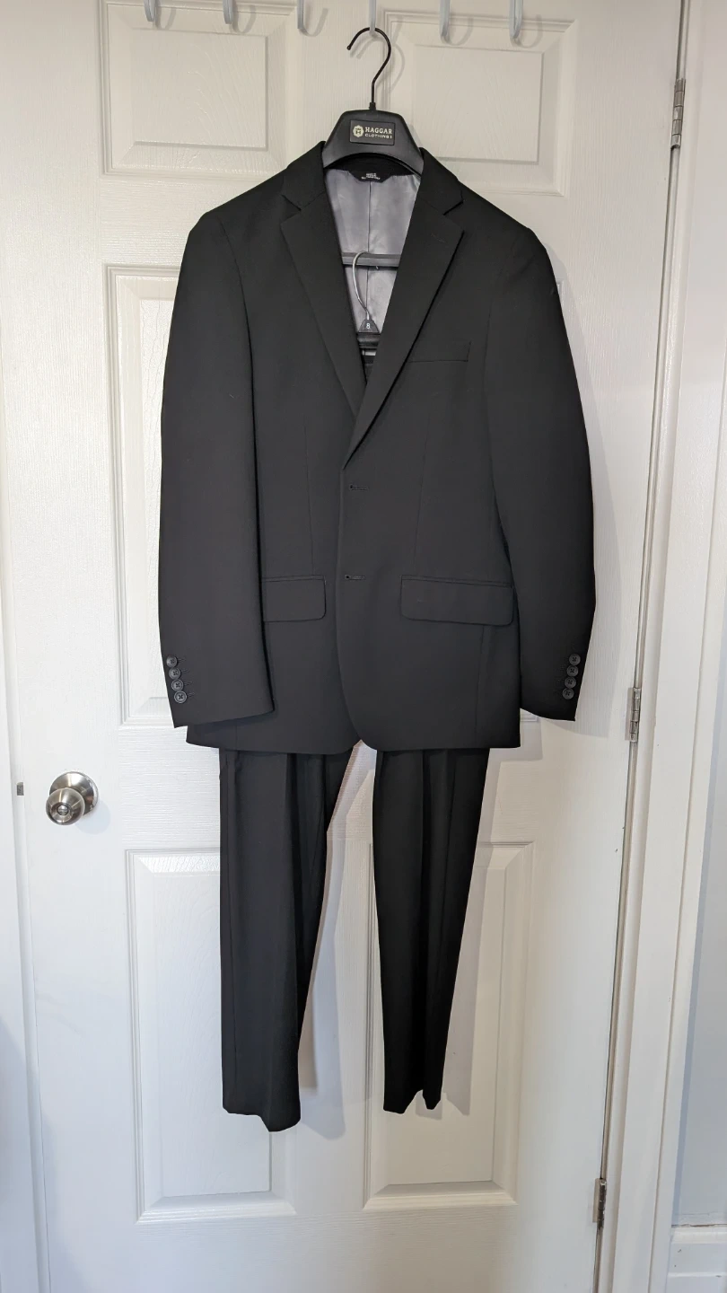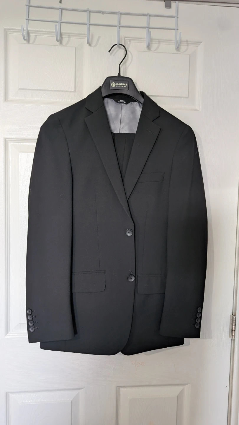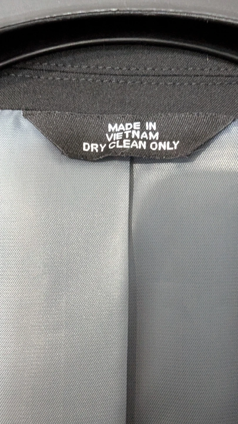 This J.M. Haggar suit set includes a black jacket and matching pants. It's a slim fit style, perfect for looking sharp. The jacket is made in Vietnam and requires dry cleaning.
