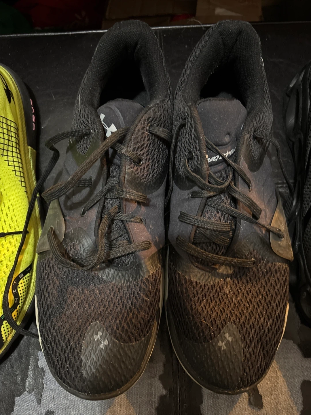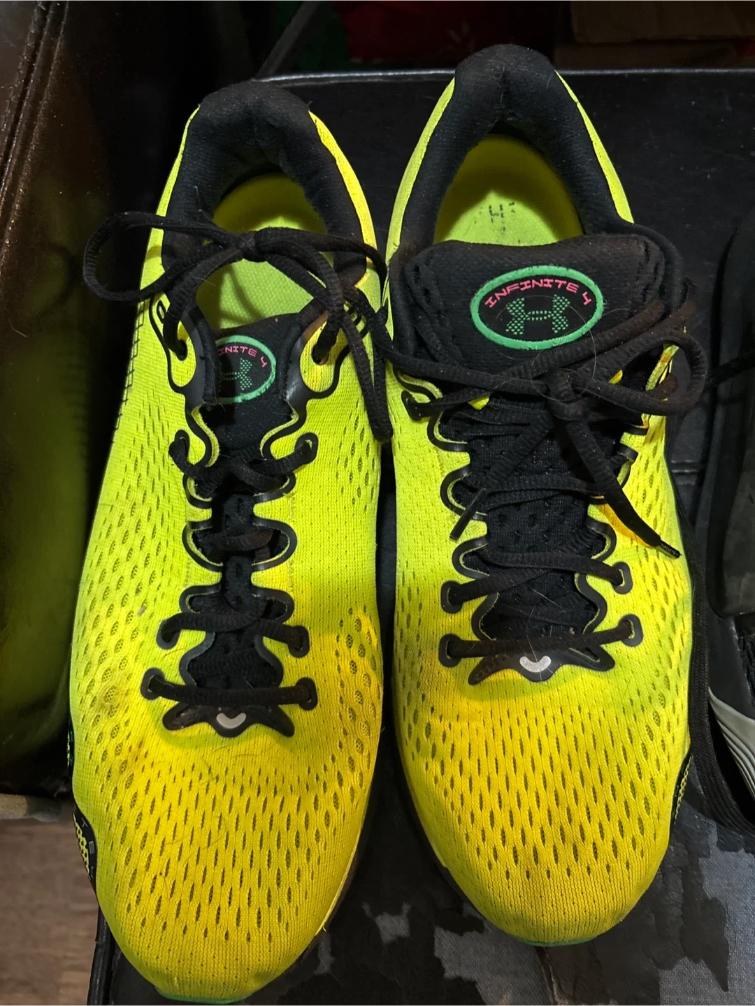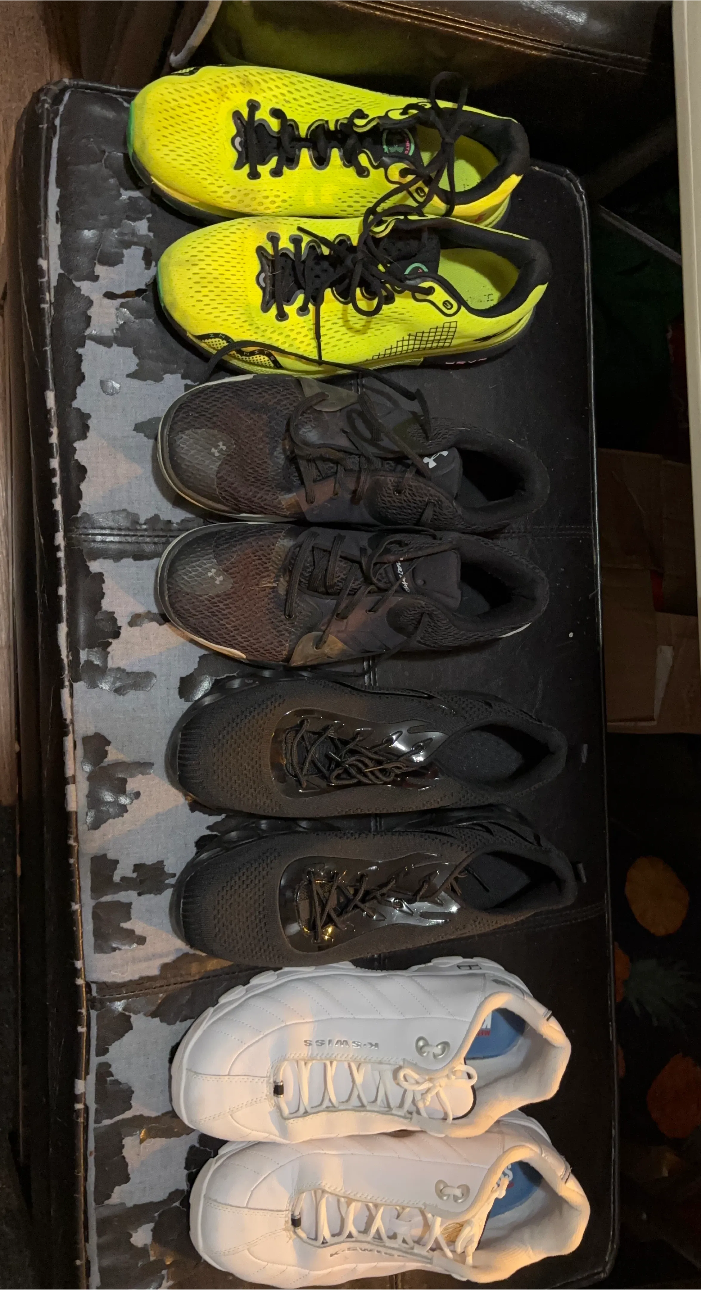 Three pairs of running shoes. Includes a pair of bright yellow Under Armour Infinite 4 shoes, a pair of white K-Swiss shoes, and a pair of black running shoes. Athletic footwear for your active lifestyle!all used, the k-Swiss and all black shoes are basically brand new. All size 12, 60 or best offer for all