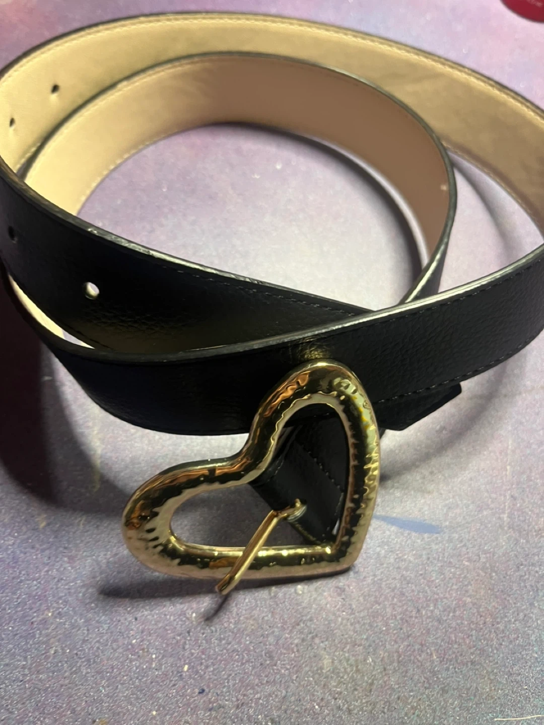 One black faux leather belt with a hammered gold heart buckle. A second clear vinyl belt is included, decorated with red and white mushrooms and colourful flower details. These belts add a fun flair to any outfit!