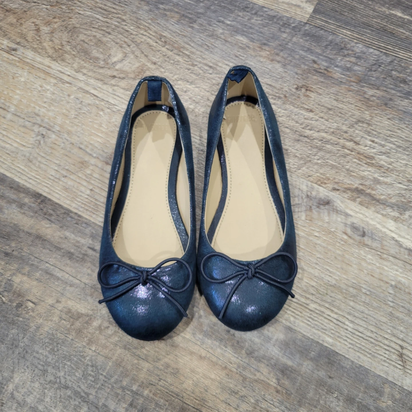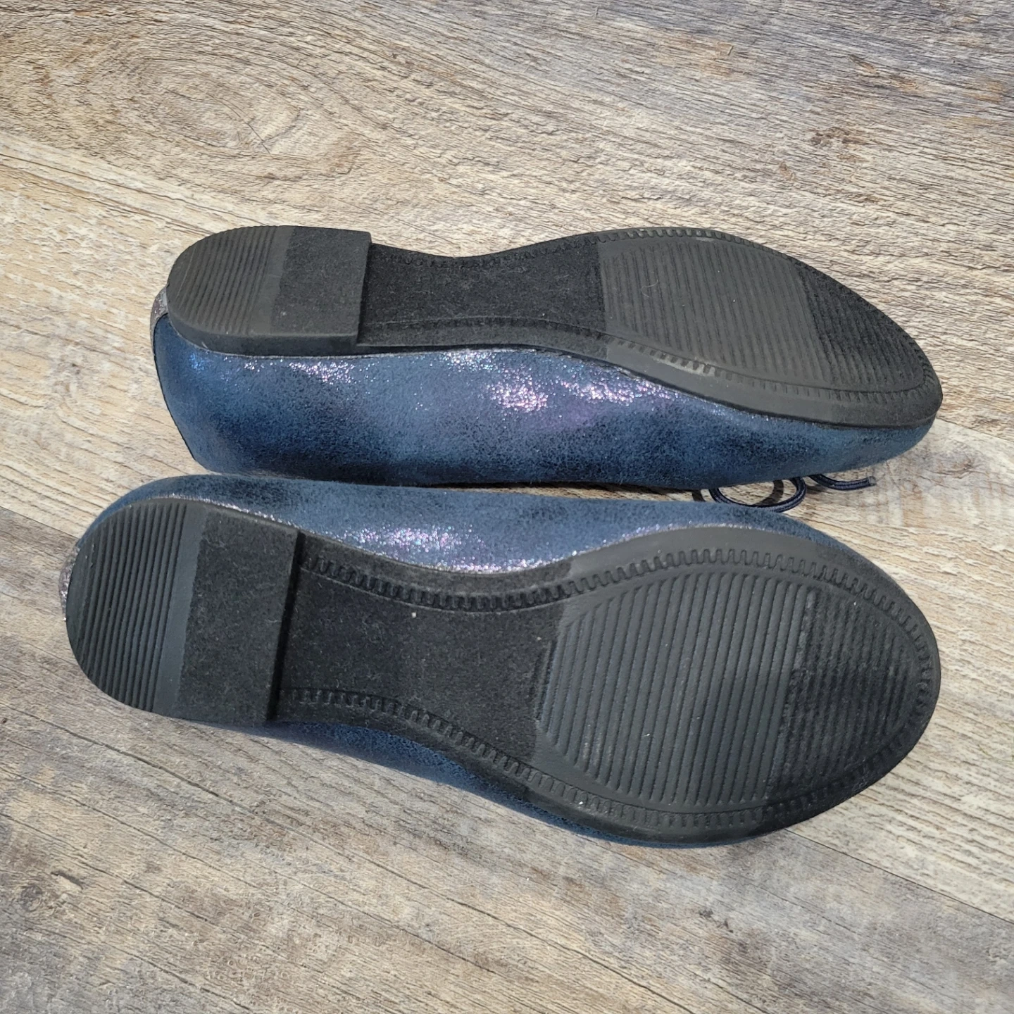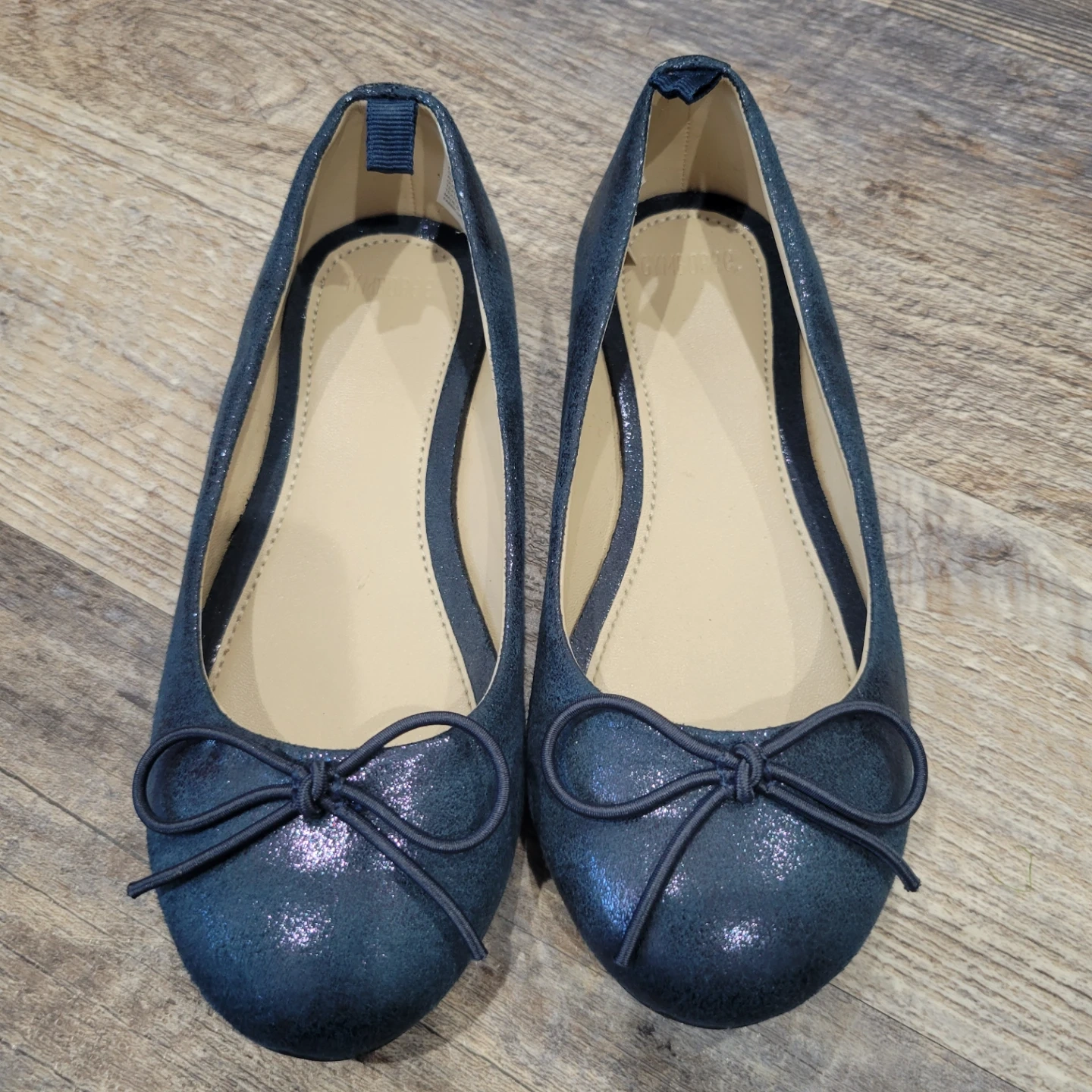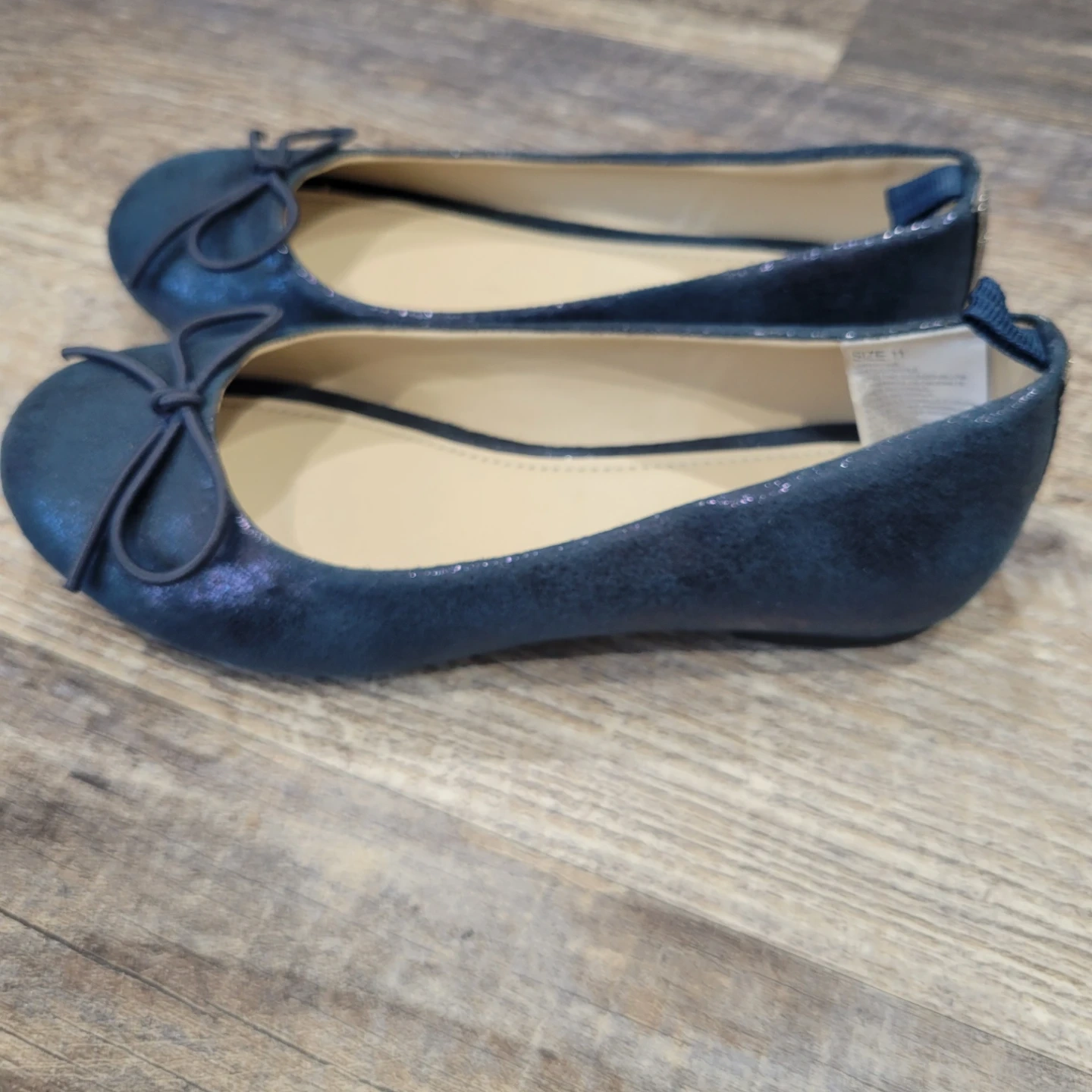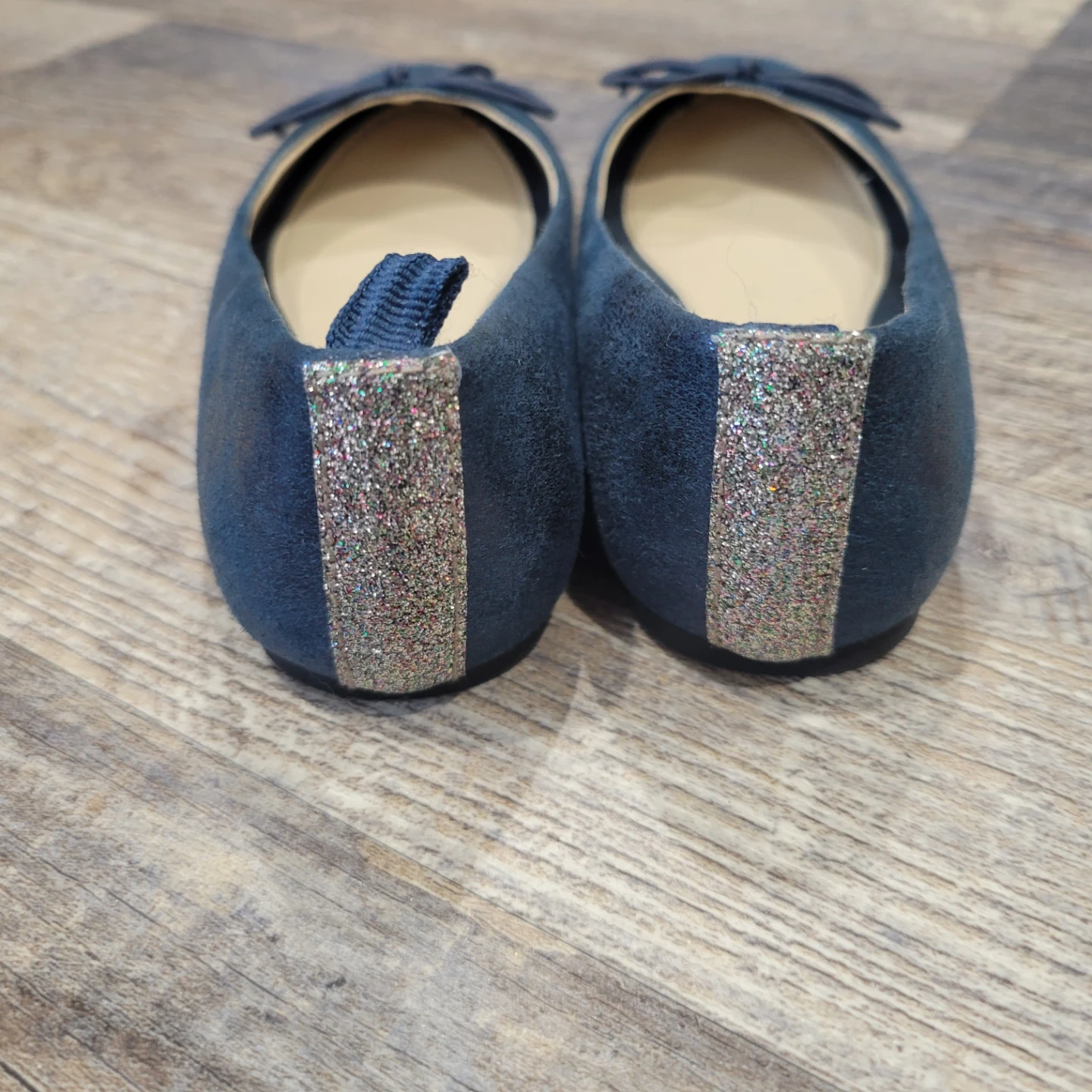 Kids' sparkly blue ballet flats with a bow accent. These are a size 11. They're made with a synthetic upper and have a rubber sole for grip. A fun shoe for any occasion!