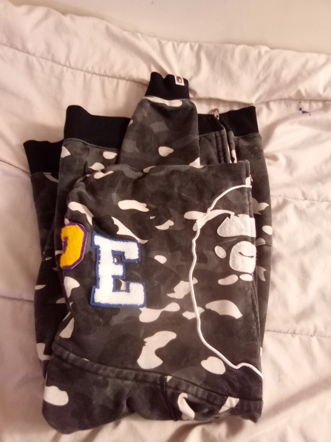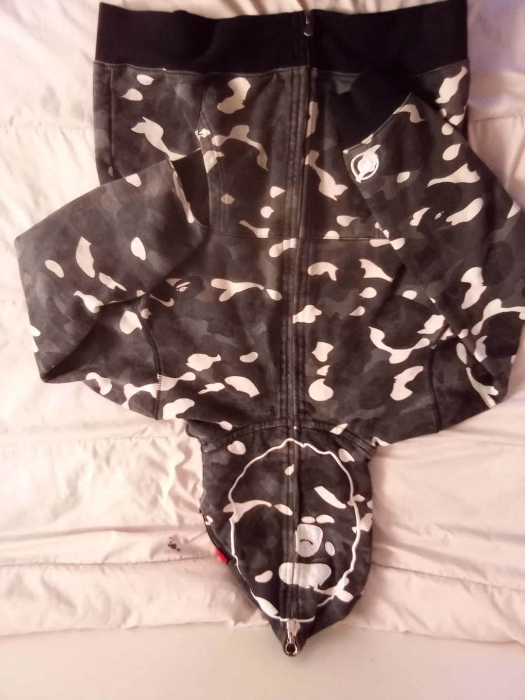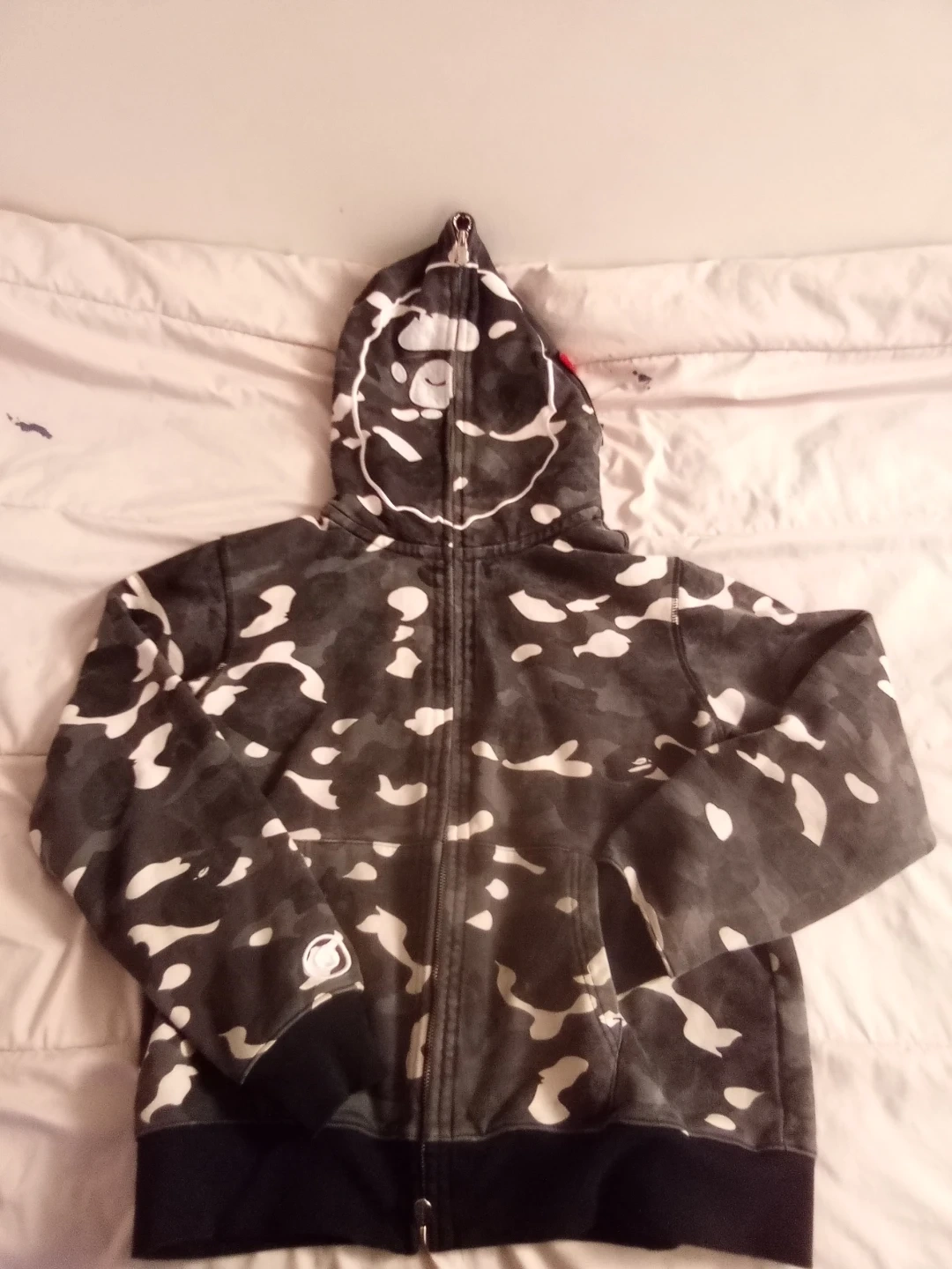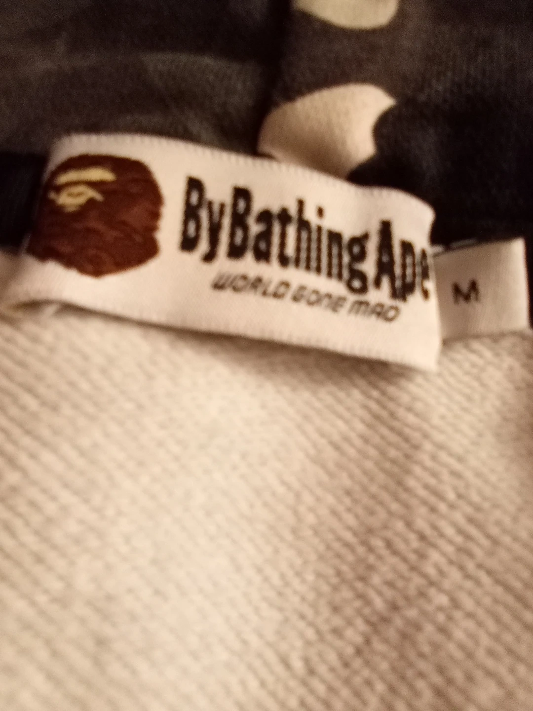 This is a BAPE full zip hoodie with a classic camo pattern. It's a size medium. The hoodie has a front zipper and two front pockets.