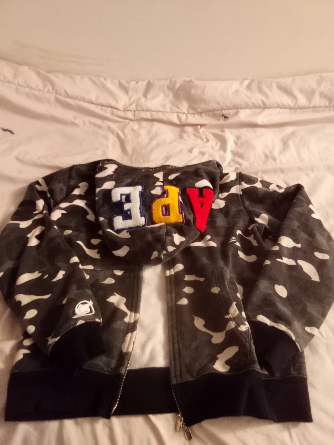 This is a BAPE full zip hoodie with a classic camo pattern. It's a size medium. The hoodie has a front zipper and two front pockets.