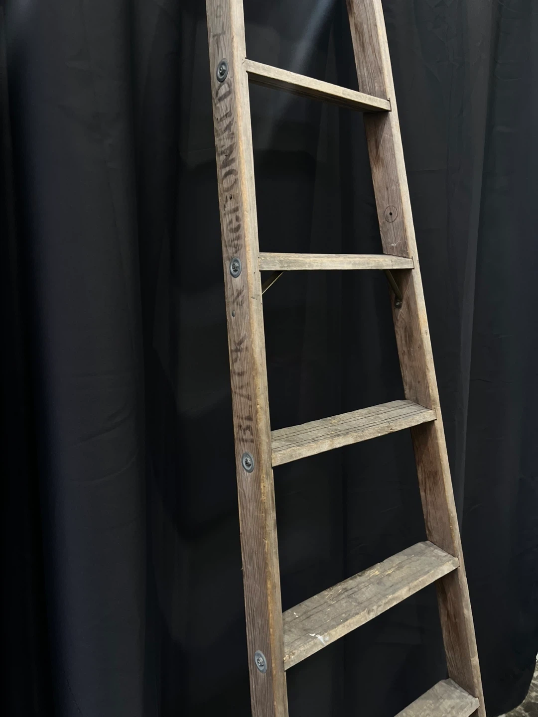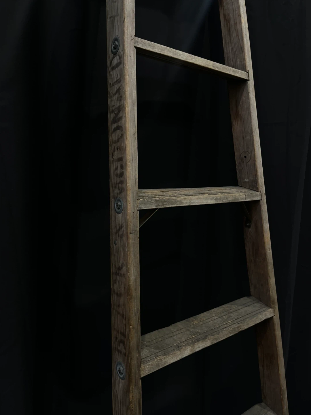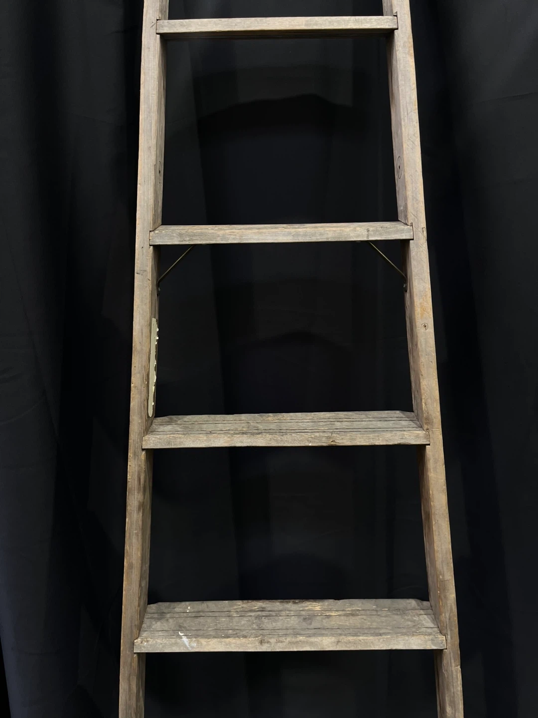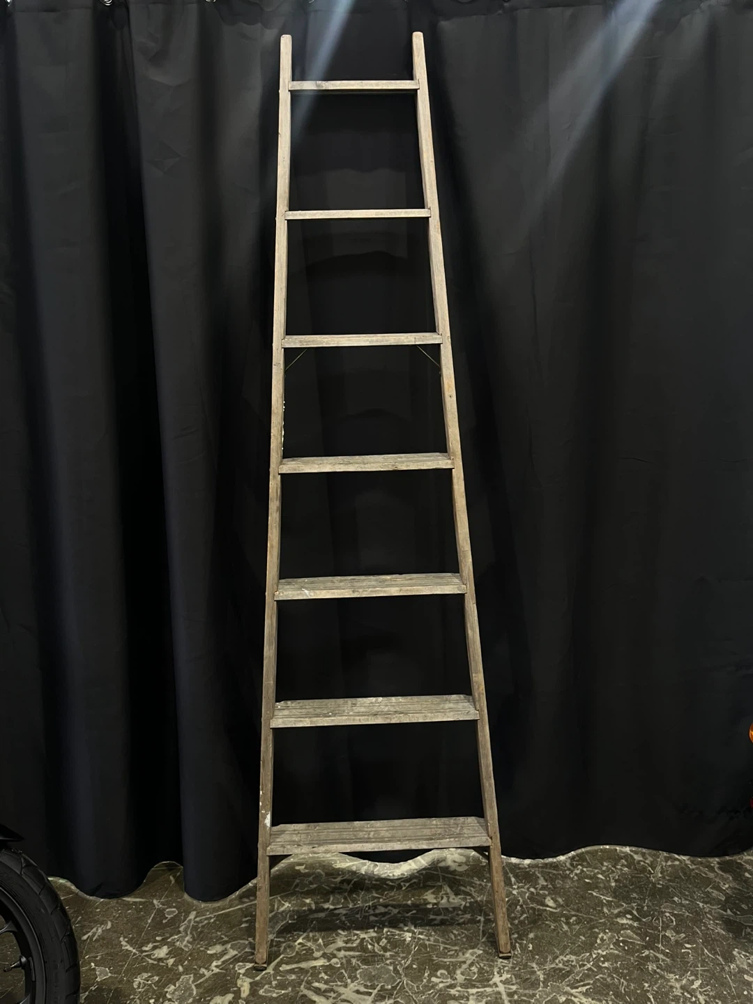 This is a rustic, vintage wooden ladder. It's made of solid wood and has a charming, weathered look. It has 7 rungs and would make a great decorative piece for a farmhouse or rustic-themed home.