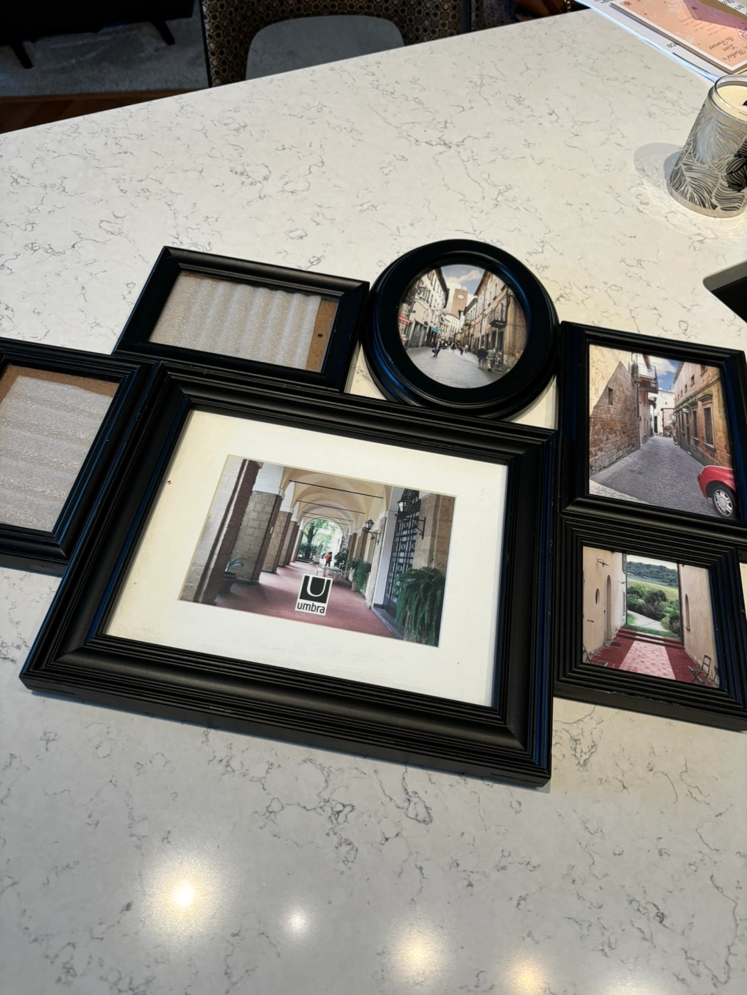 Set of 5 black picture frames, featuring a variety of sizes and shapes. The set includes a large frame with a white mat. The frame is new, never used.