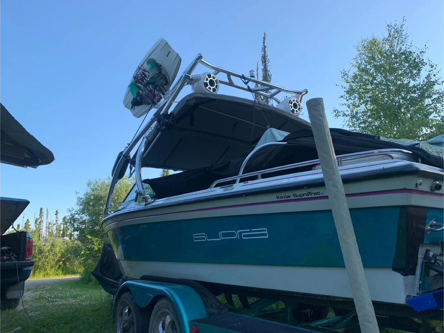 This is a Supra ski boat made to surf. , model " Bravura Classic Kevlar SupraTrac". It's white and teal with a tower and wakeboard rack. Perfect for hitting the lake! Surf tabs and ballast bags. 430 hp 7.4 454 , new MSD distributor and msd coil. This boat throws a wave equal to a 20’ wakesetter and I can prove it ! Wetsounds tower speakers. 10” sub. GPS speedometer upgrade.