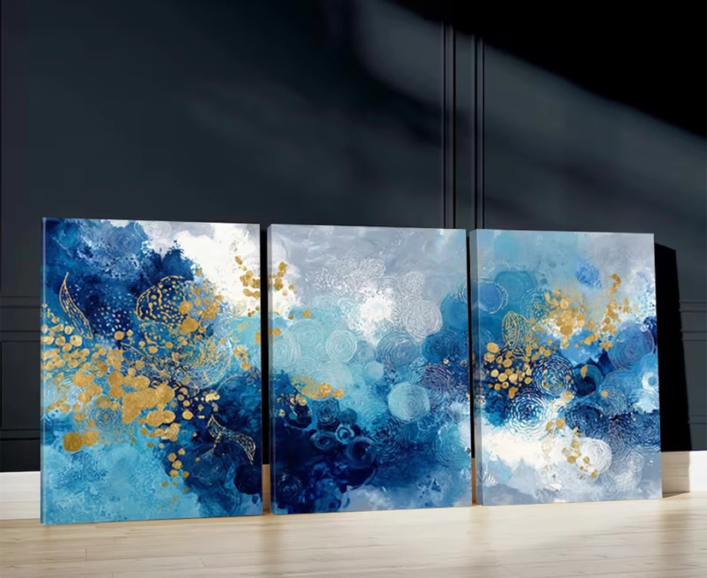 Three canvas art pieces featuring abstract blue and gold watercolour-style designs. They're textured style and vibrant, adding a pop of colour to any room. This artwork is ready to hang and adds a modern touch to your decor.