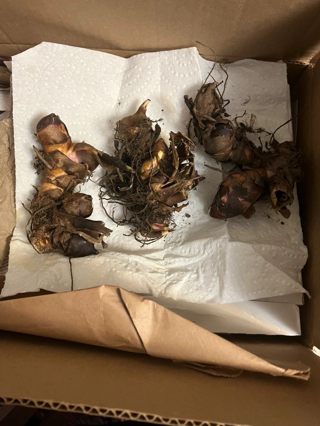 Four Canna Lily bulbs, ready for planting. These will grow into vibrant red flowering plants. They're healthy and have been stored in a cool, dry place.
