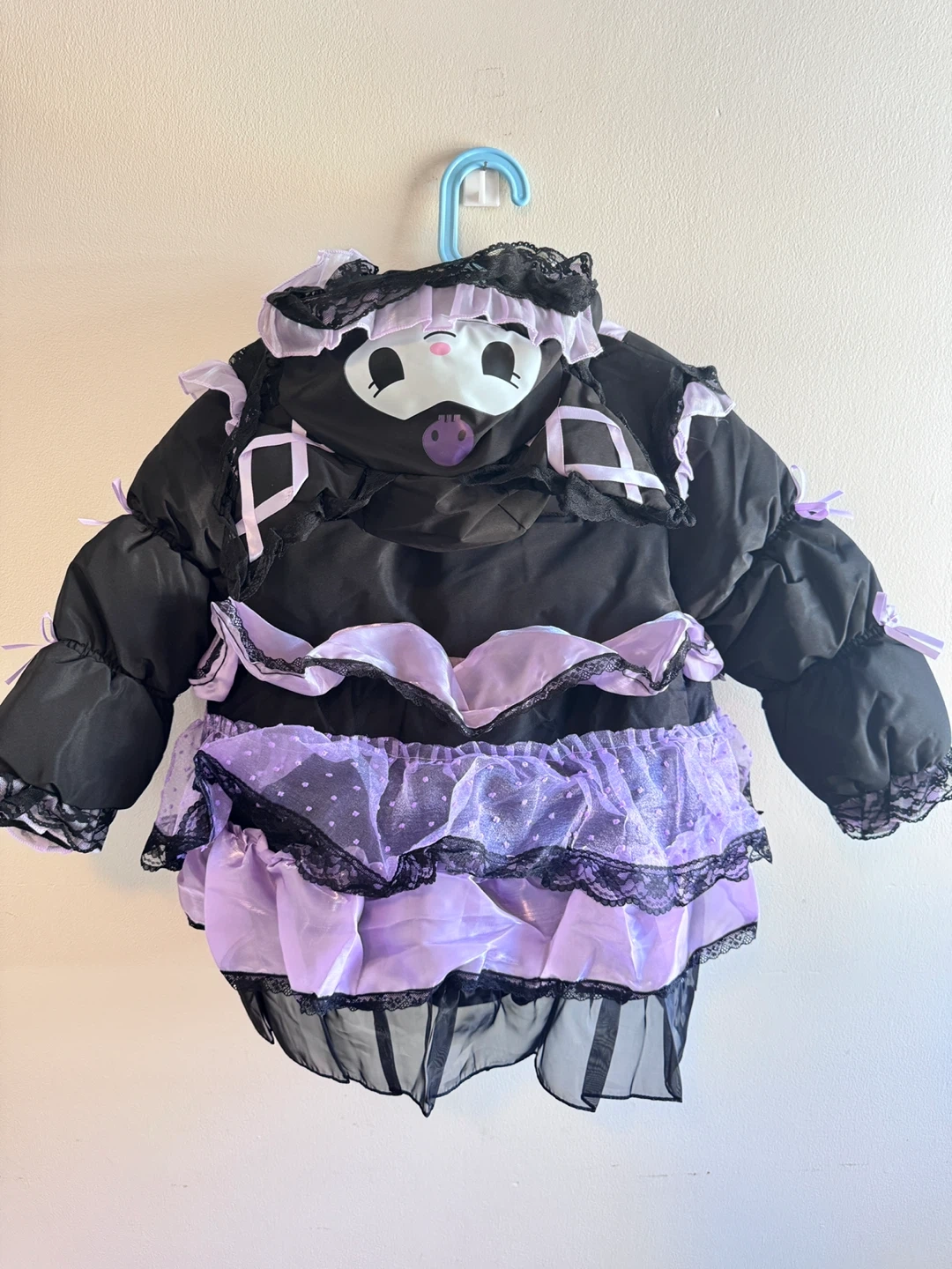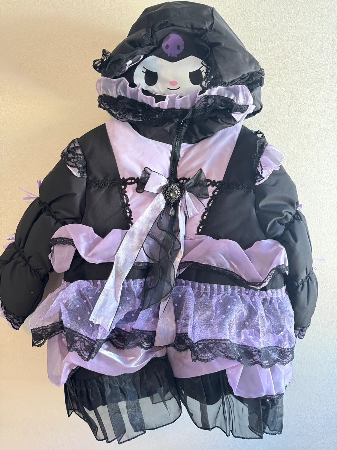 This black and purple puffer jacket features a Kuromi character design with ruffles and lace trim. It has a zip-up front and a hood. The jacket is made of polyester with a satin-like sheen on some panels.