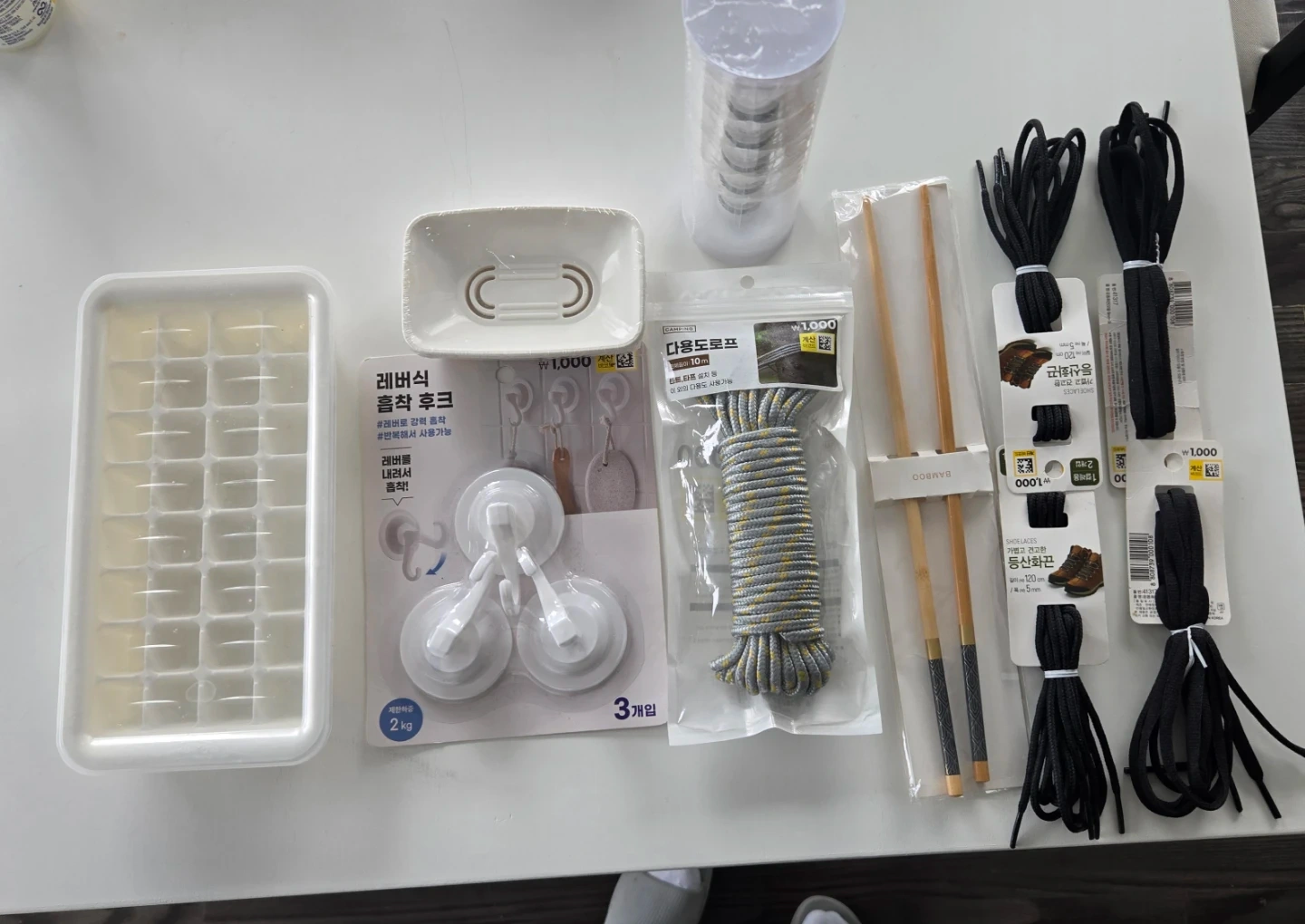 This lot includes a 36-cube ice tray, a white soap dish, three suction cup hooks with a 2kg weight capacity, a package of patterned rope, a pair of bamboo chopsticks, and several pairs of black shoelaces. These are useful items for everyday home organization and repairs.