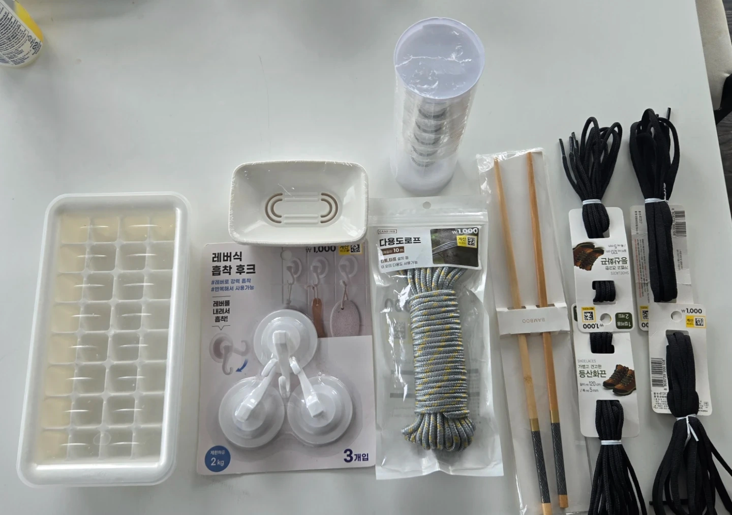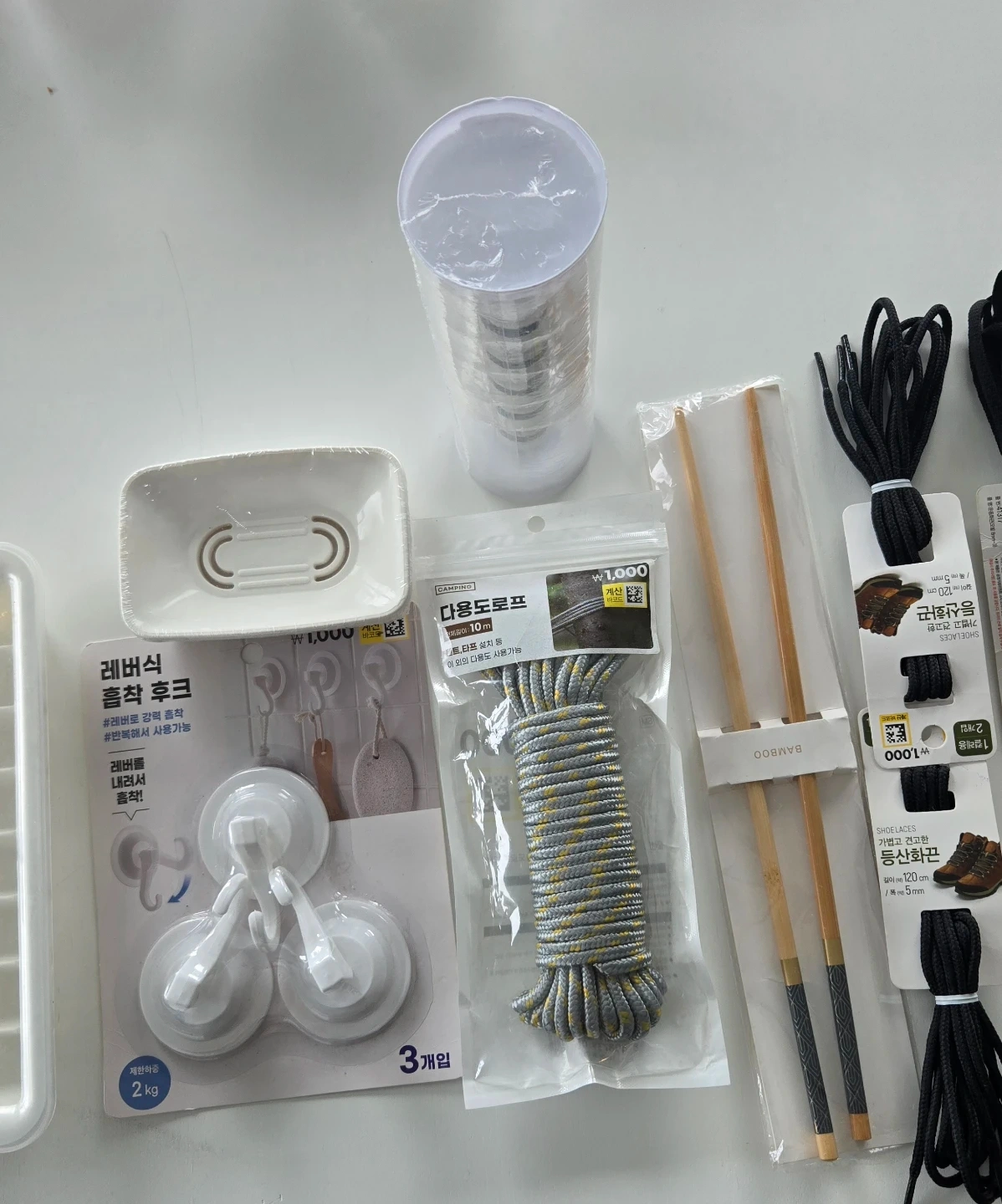 This lot includes a 36-cube ice tray, a white soap dish, three suction cup hooks with a 2kg weight capacity, a package of patterned rope, a pair of bamboo chopsticks, and several pairs of black shoelaces. These are useful items for everyday home organization and repairs.
