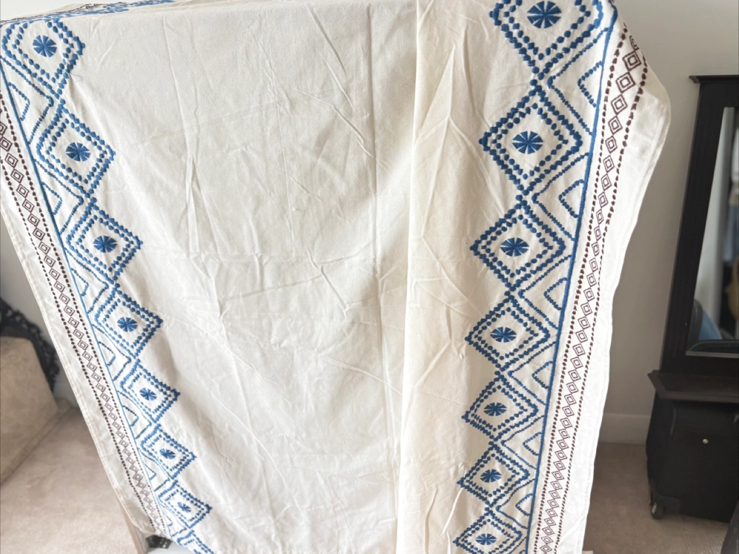 Selling a lovely embroidered table cloth . It features a beautiful blue and brown embroidered pattern on a cream-coloured background. Perfect for adding a touch of warmth and style to your home!