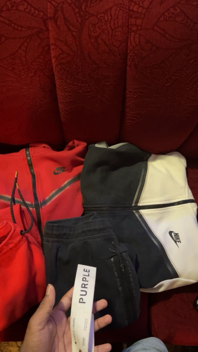 This is a Nike Tech Fleece set featuring a red full zip hoodie and black joggers. The hoodie has a zippered closure and the joggers are made for comfort and style. It's great for athletic wear or casual outings.
