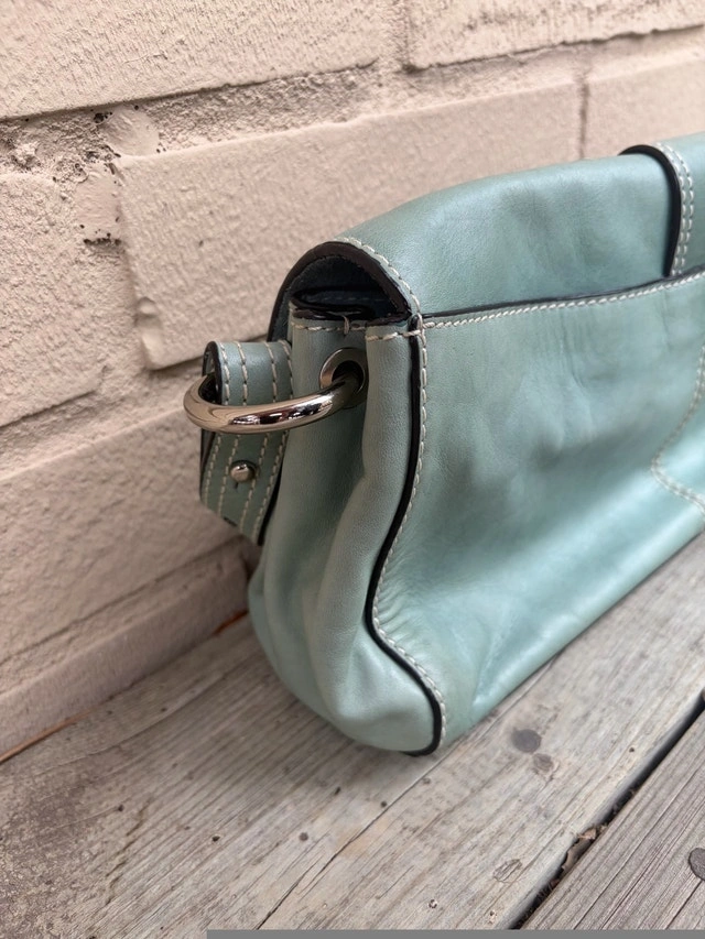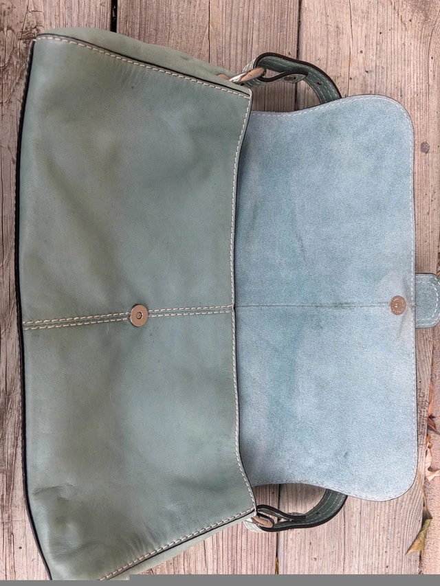 Beautiful authentic Francesco Biasia Italian leather bag in soft light sage green color. Features premium stitching, magnetic flap closure, and quality silver hardware. Spacious interior with brown logo lining, made from supple genuine leather. Timeless and elegant — perfect for daily wear or as a chic statement piece. Condition: Excellent pre-loved condition, clean interior, minimal signs of wear. Made in Italy Pick up - Oakville/ Burlington