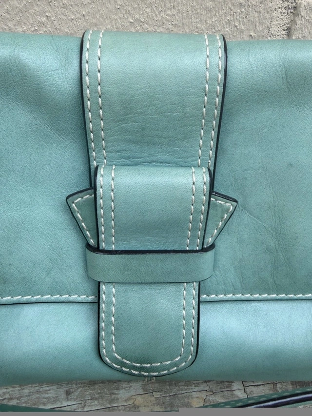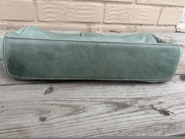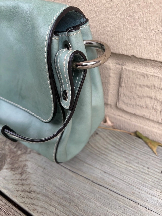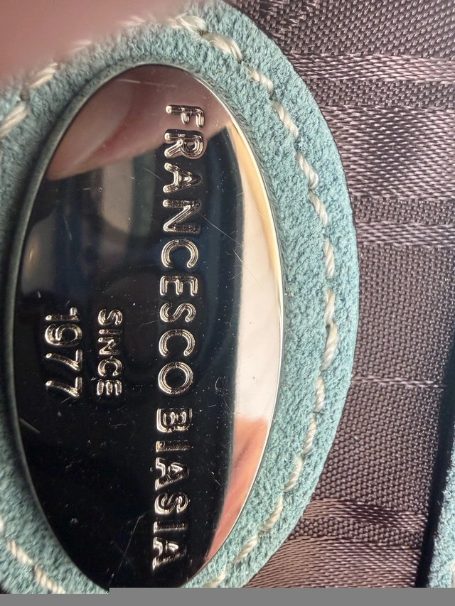 Beautiful authentic Francesco Biasia Italian leather bag in soft light sage green color. Features premium stitching, magnetic flap closure, and quality silver hardware. Spacious interior with brown logo lining, made from supple genuine leather. Timeless and elegant — perfect for daily wear or as a chic statement piece. Condition: Excellent pre-loved condition, clean interior, minimal signs of wear. Made in Italy Pick up - Oakville/ Burlington