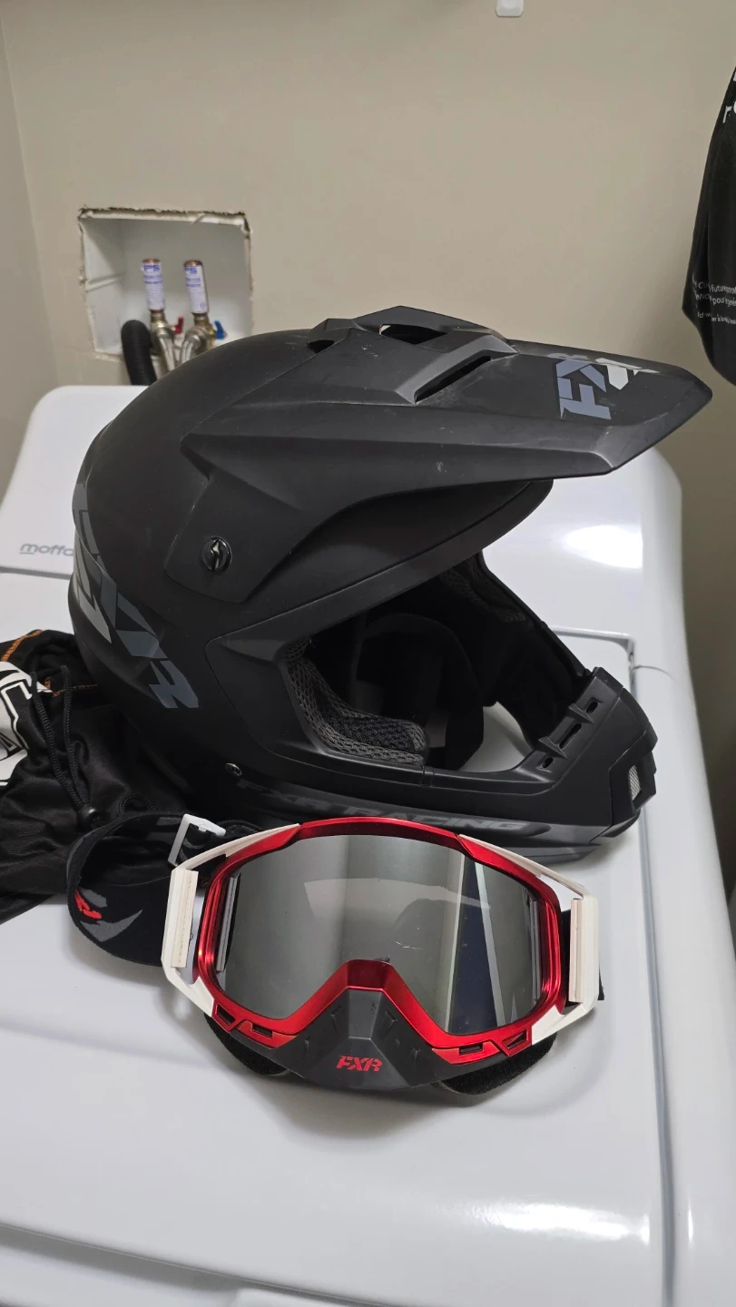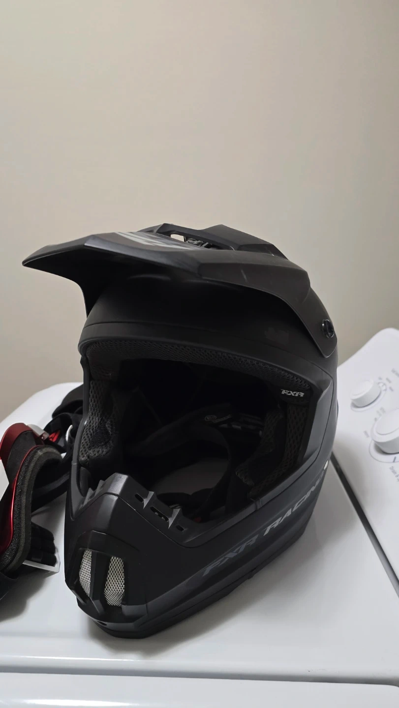 Selling a FXR racing helmet and goggles set. The helmet is black and in great condition. Perfect for anyone looking for reliable head protection during their rides! Comes with a FXR helmet bag. Size large