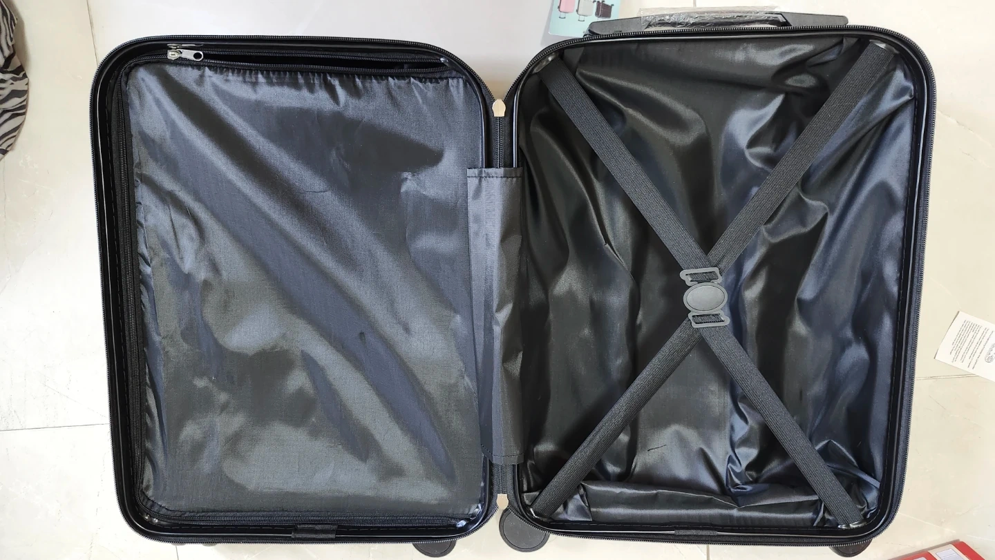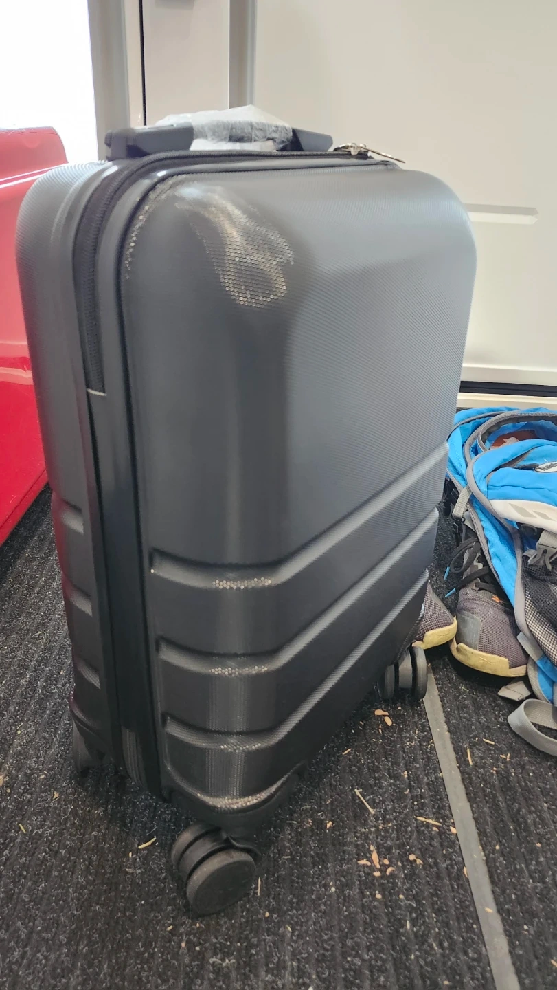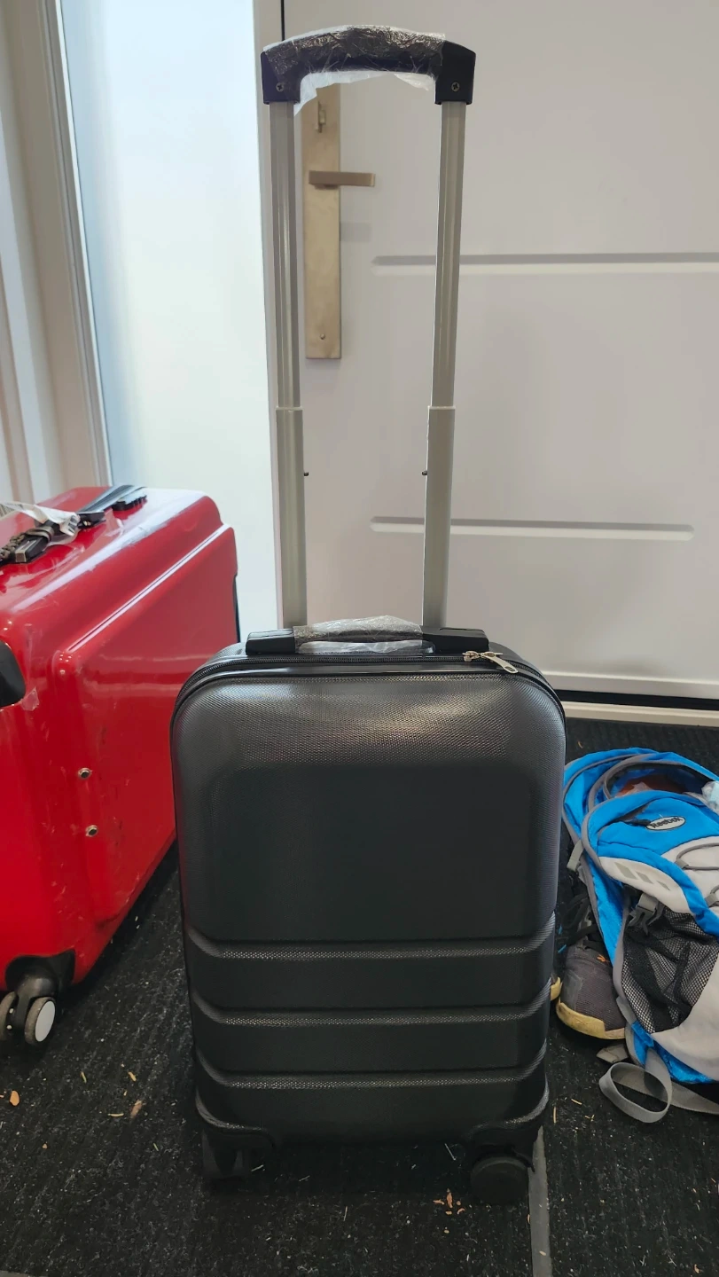 Selling a new black carry-on suitcase! It features a retractable handle and four wheels for easy maneuvering. Includes lock